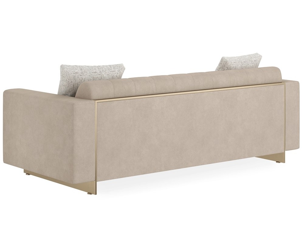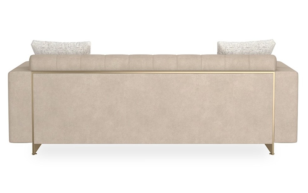 The Well-Balanced Sofa features a chic, cosmopolitan design with elegant channel tufting and a luxurious Moonstone-hued fabric. Its lightweight construction is elevated by a continuous Whisper of Gold framework, adding a sophisticated touch.