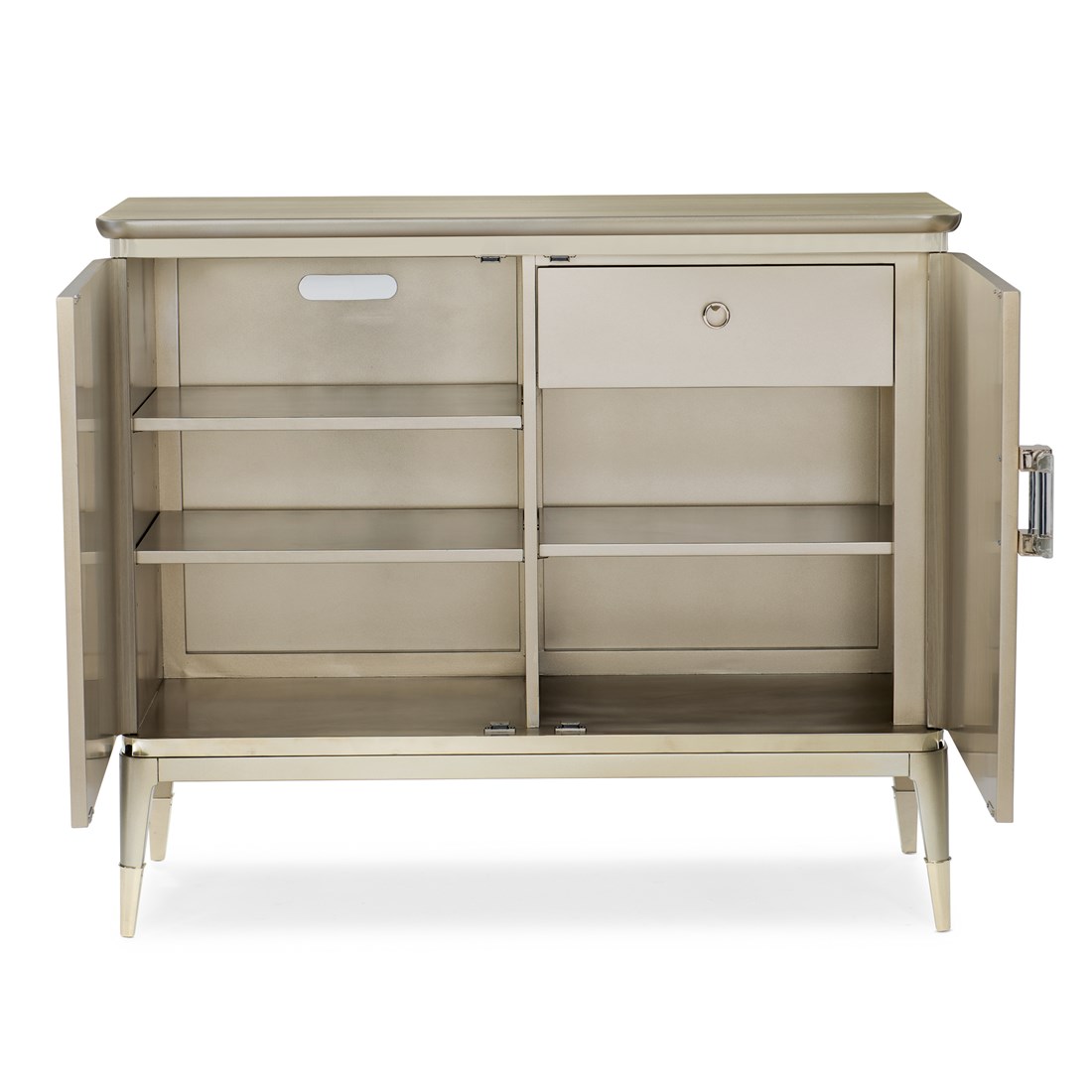 A shimmer of light is all it takes to transform a room with beauty. This signature piece stands out from the crowd with its elegant shimmering exterior and plated Whisper of Gold trim, ferrules, and hardware. A delicate silkscreened leaf pattern gives it modern organic character while inside you'll find adjustable shelves, a drawer, and wire management. Inspired by our best-selling TURN A NEW LEAF buffet, this smartly scaled piece is perfect for urban spaces.