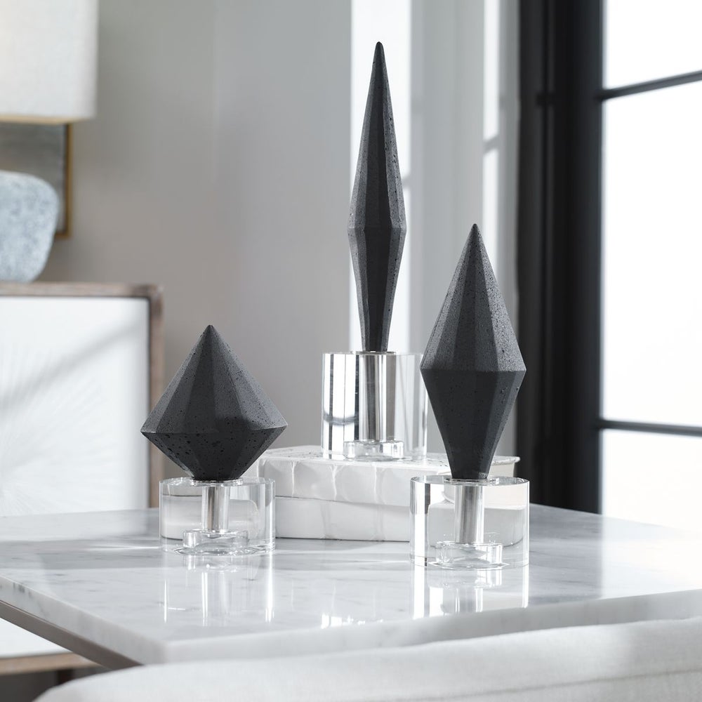 Elegant black diamonds crafted from black man-made stone atop crystal bases.