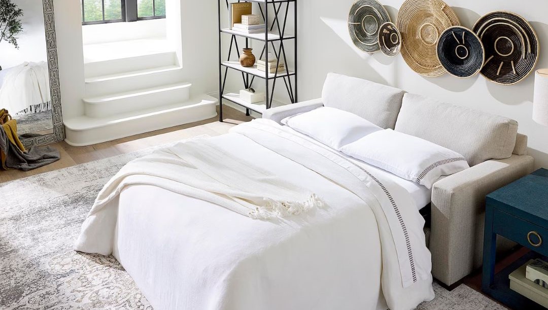 An easygoing transitional style makes the Anson Sofa the centerpiece of your room. Soft, attached boxed back cushions and top-stitched seat cushions beckon family and guests to have a seat. Low block legs with Brindle finish complement the fabric options. This sleeper version with a queen standard innerspring mattress is a must have in every home.