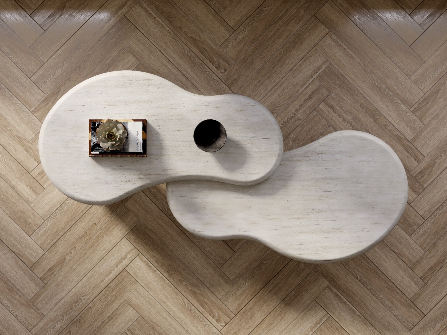 Rooted in coastal elegance, this low cocktail table brings a sense of calm and grounded beauty to any living space. The smooth, organic wood top features a warm, bisque finish that highlights natural grain and texture, while the resin legs offer a handcrafted, stone-like presence with their gently curved form and brushed paint detail. The result is a piece that feels both artisanal and modern, effortlessly balancing softness, structure, and tone. Perfect as a sculptural focal point, it pairs well with relaxed, neutral palettes and layered, contemporary styling.