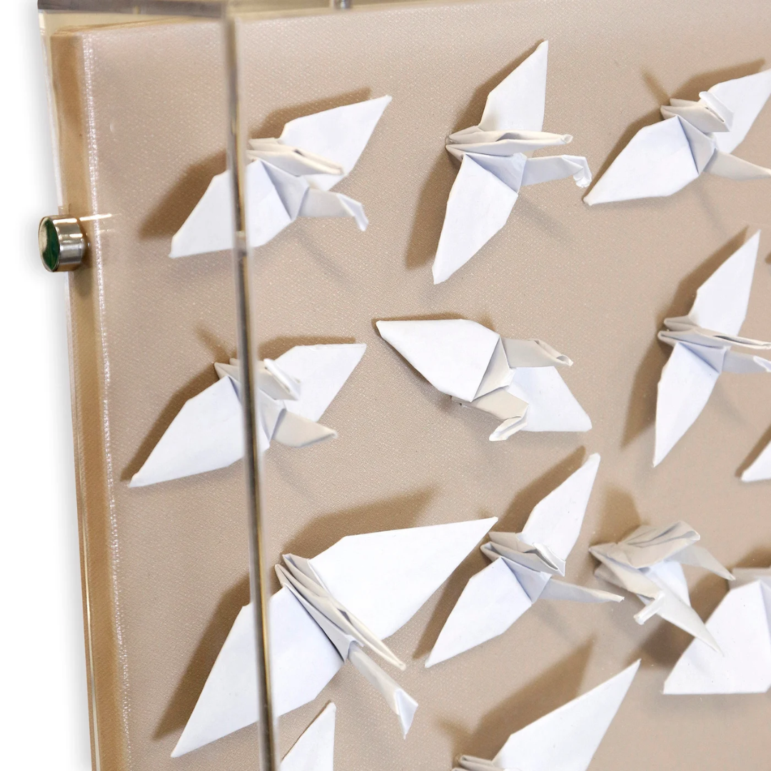 The Azusa Paper Crane Art features hundreds of intricately folded white paper cranes arranged in a mesmerizing pattern, capturing the delicate beauty of traditional origami. Its neutral tones and large-scale design make it a perfect statement piece for any room.