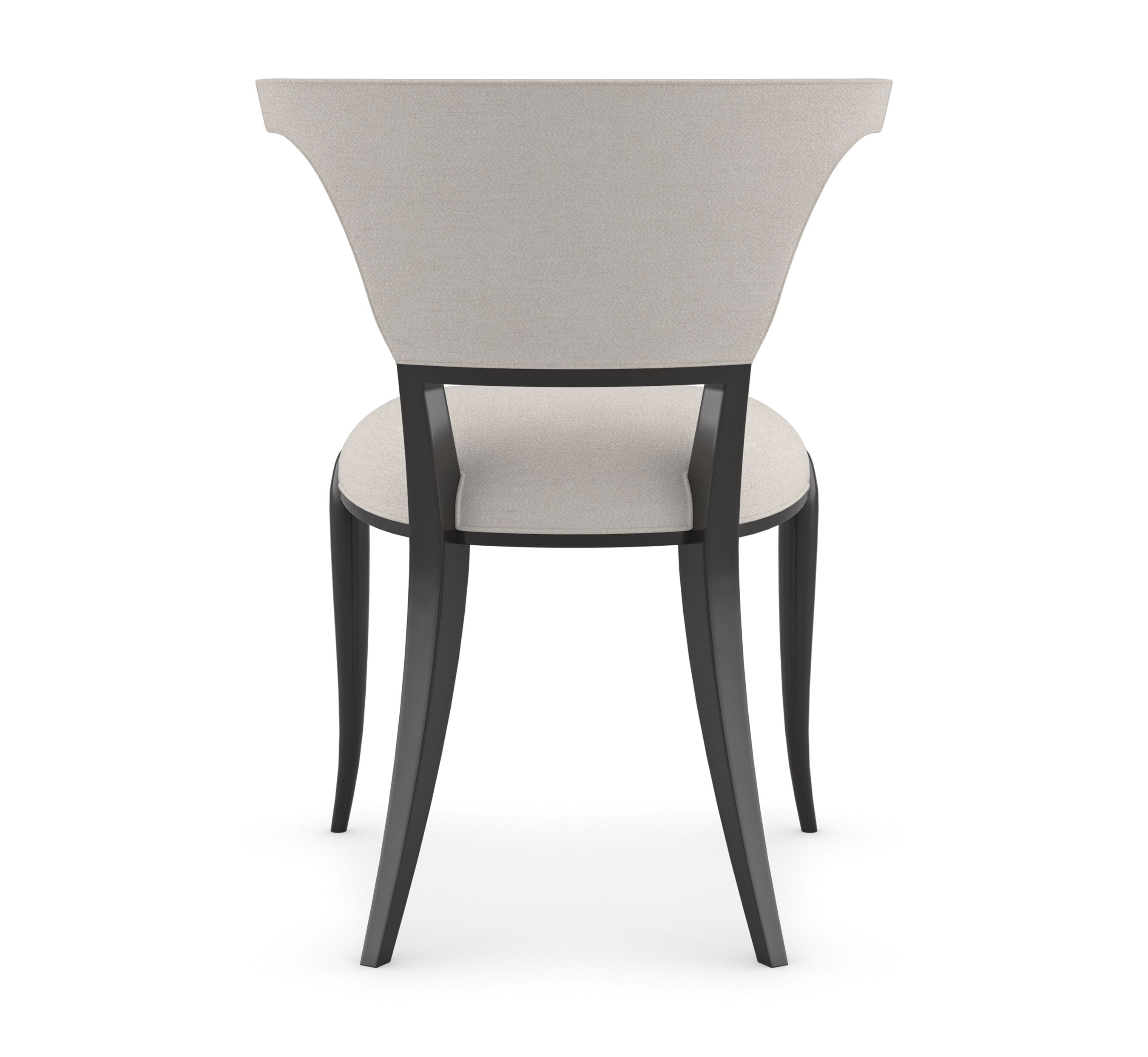 With a nod to classical forms, this elegant dining chair takes inspiration from the Klismos style, designed by the ancient Greeks. Our contemporary take lends a sleek silhouette with a concave backrest and splayed legs at the back. An Almost Black finish adds depth and rich contrast to fine tailoring in a soothing neutral performance fabric that's easy to keep looking pristine. The perfect companion to a dining table in the round.