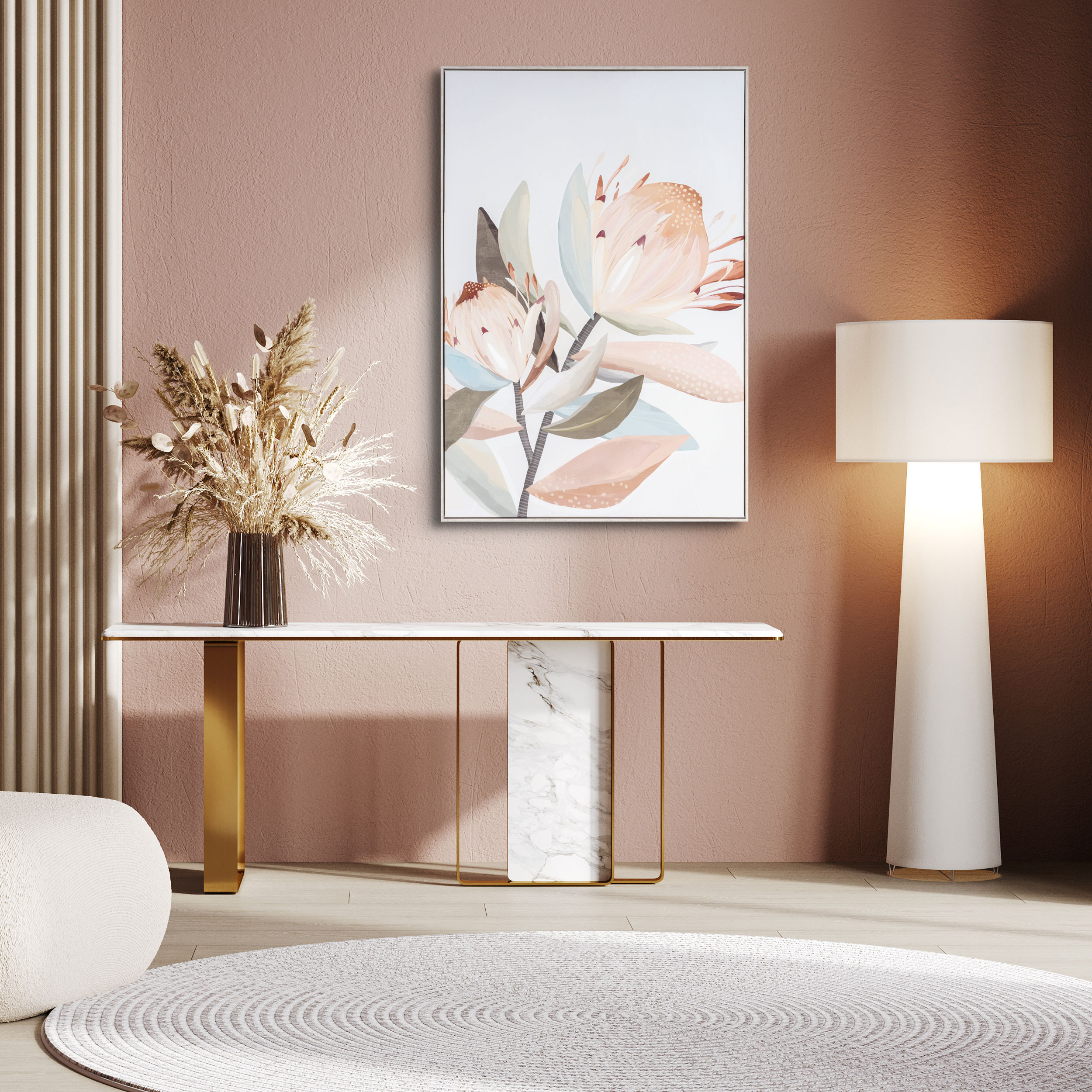 Step into a realm of serene beauty with this captivating print, showcasing a resplendent protea flower in delicate shades of light pink, blue, and green. Each brushstroke is a testament to nature's elegance, further enhanced by meticulous hand embellishment. Encased in a sophisticated polycomposite frame with a wood-inspired finish, measuring a striking 32" x 48", this piece exudes timeless charm. Indulge in the allure of botanical artistry with this exquisite creation, available in two distinct variations that effortlessly harmonize yet stand out individually