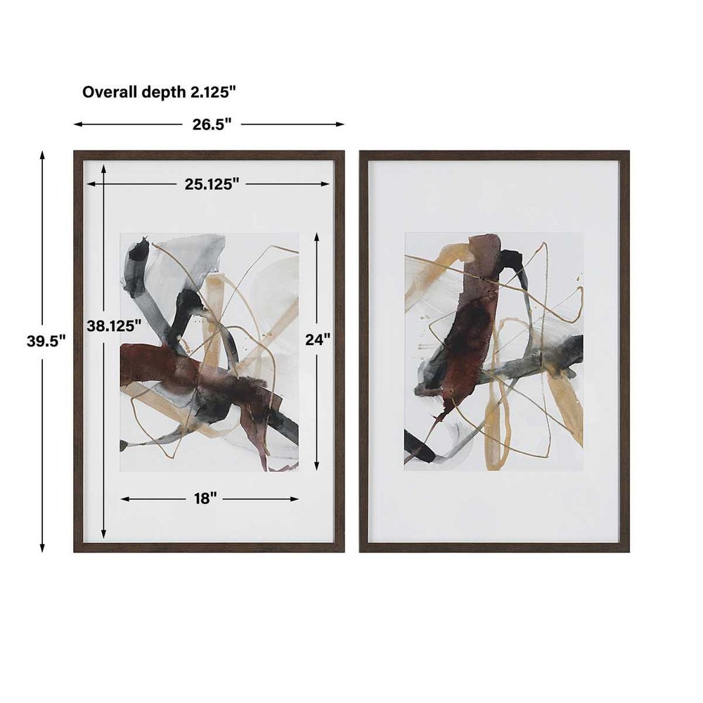 The Burgundy Interjection Framed Prints S/2 feature a harmonious blend of neutral brushstrokes in gray, black, and warm chestnut tones. Each print is accented with a white mat under glass and framed in a dark walnut finish, offering a sophisticated touch to any space. Artwork by Jennifer Goldberger.