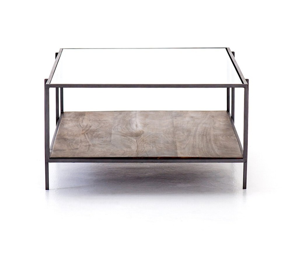 A shadowbox-style coffee table clears the way for your inner collector. Display prized possessions within a glass enclosure of gunmetal-finished iron framing and aged brown mango wood.
