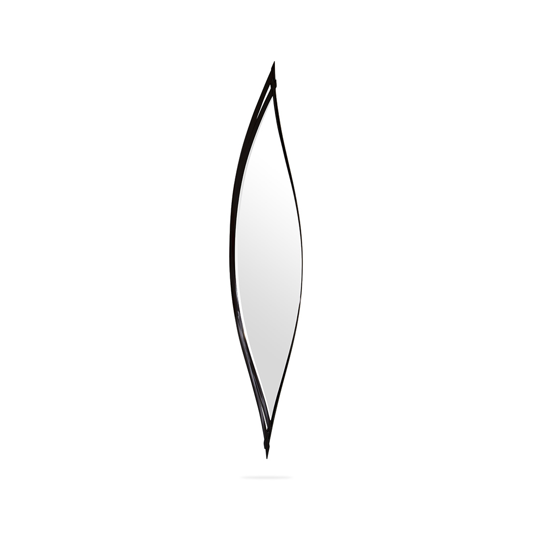 The Celeste Mirror features a handcrafted mahogany frame in a rich Havana finish with a graceful, leaf-like silhouette. Its beveled glass adds depth, perfect for modern or minimalist interiors.