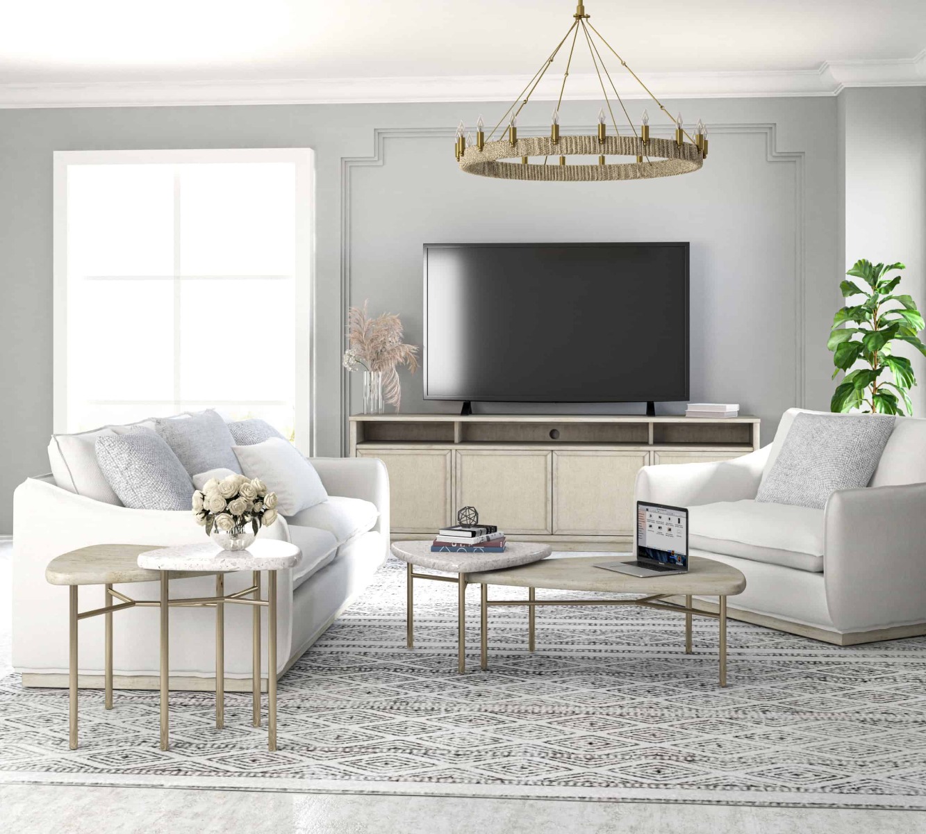 The Cotiere 2-Piece Bunching End Tables feature terrazzo and wood tops in soft, rounded shapes. Bronze metal bases create a light, open look. Scaled-down and stylish, they offer versatile, vintage-inspired charm.