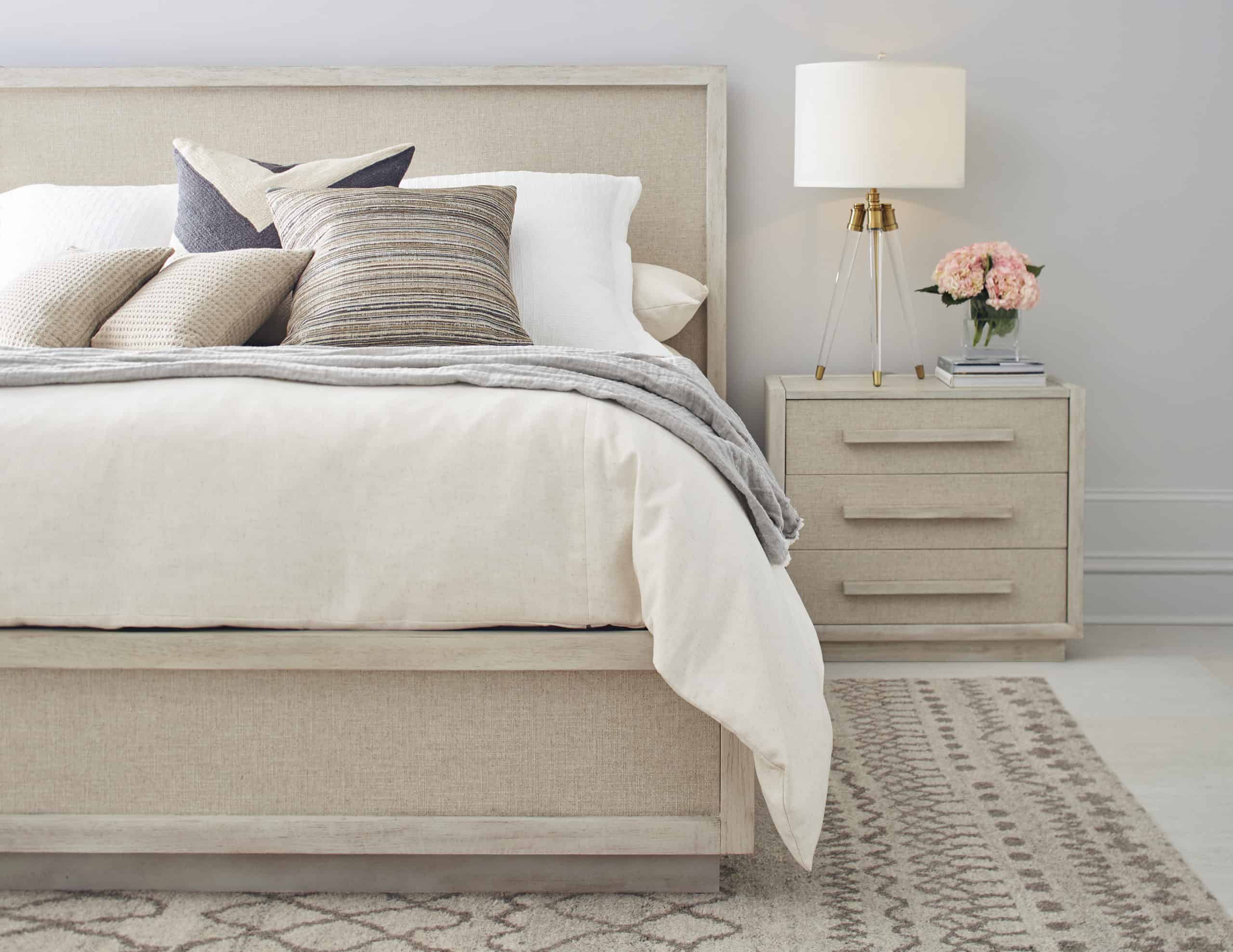 The bold geometry of the Cotiere collection represents the perfect intersection of form and function, seen here in a solid base nightstand with oversized drawer pulls that evokes the style of contemporary architecture. Combining three light wood drawers with woven fabric fronts, this nightstand delivers modern bungalow style at its best.