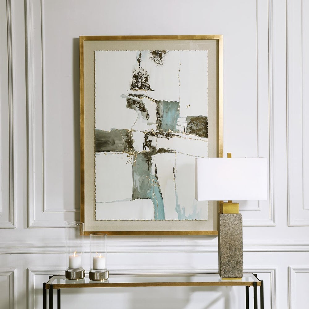 The Crosswalk Framed Print features hand-painted watercolor artwork on parchment, showcasing dark gray-blue, charcoal, and light taupe tones with dimensional gold leaf embellishments. The hand-torn edges are set against a beige linen background, and the piece is framed in a light gold-finished shadow box under glass. It can be hung horizontally or vertically for added versatility.