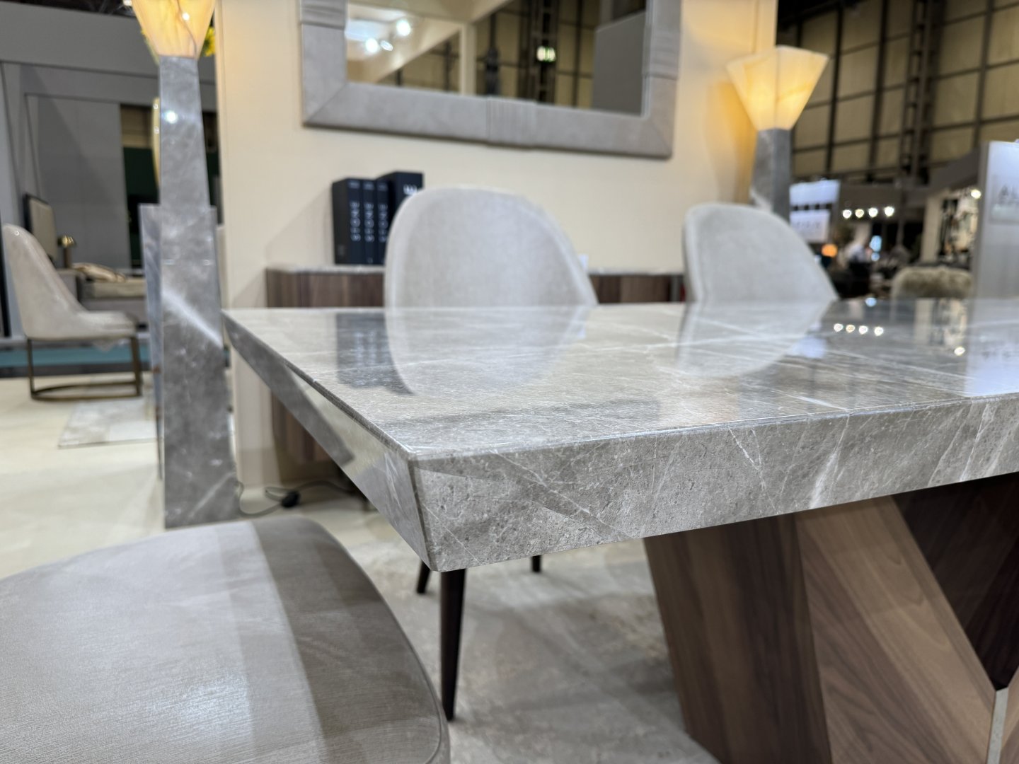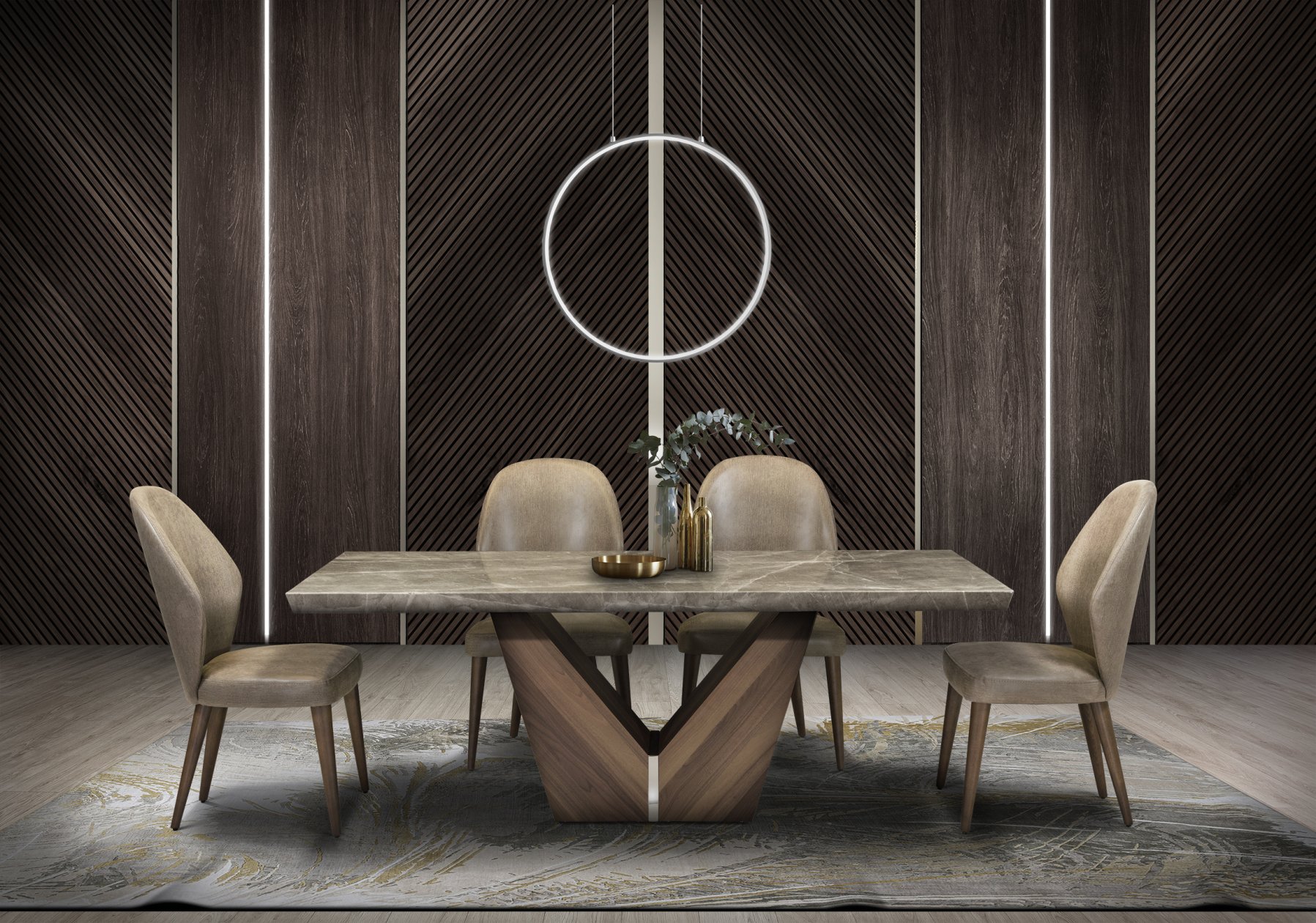 The Dakota Rectangular Dining Table embodies a refined sense of elegance and architectural sophistication. Part of the Dakota Collection, this table draws inspiration from clean lines and balanced forms, creating a commanding yet graceful presence in any contemporary dining space. The standout feature of the Dakota table is its bold "V"-shaped wooden base, designed to highlight the natural beauty and grain of the wood. A slender vertical metal insert available in Polished Steel or Oxybronze adds a modern accent that elevates the table's sculptural appeal. Topping the base is a luxurious natural marble surface, available in a variety of finishes to suit your style. The thick, inclined edge enhances the substantial feel of the stone while maintaining visual lightness through elegant detailing.