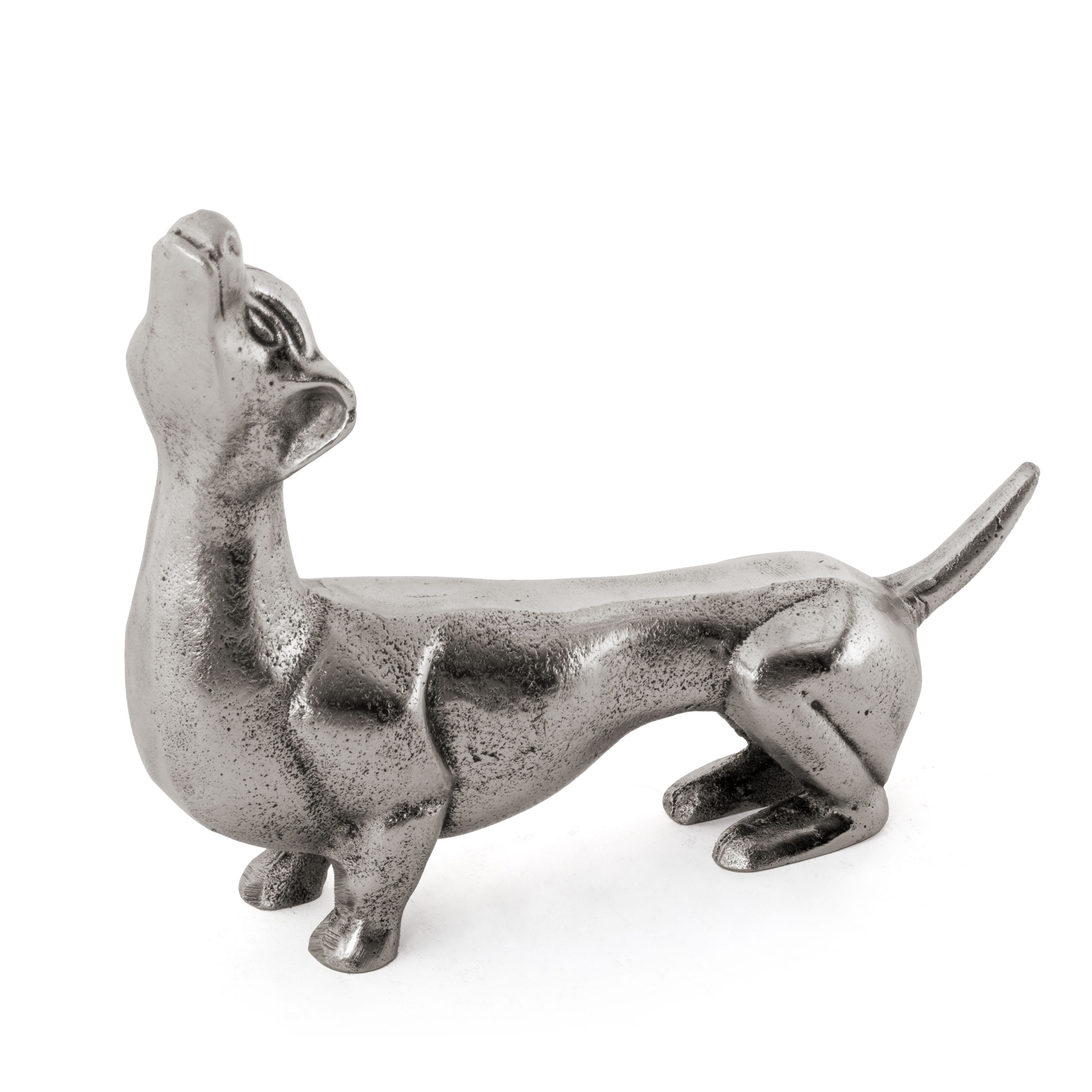 Indulge in the whimsical charm of our cast aluminum dachshund, a petite yet captivating decorative piece. Standing at 9 inches tall, 2 inches wide, and 7 inches long, this sculpture exudes personality with its intricate craftsmanship. Choose between the opulent antique gold or the sleek antique nickel finish to seamlessly integrate this delightful canine accent into your space. A testament to both artistry and style, this metal dachshund effortlessly complements any interior, making it a standout addition to your curated home decor