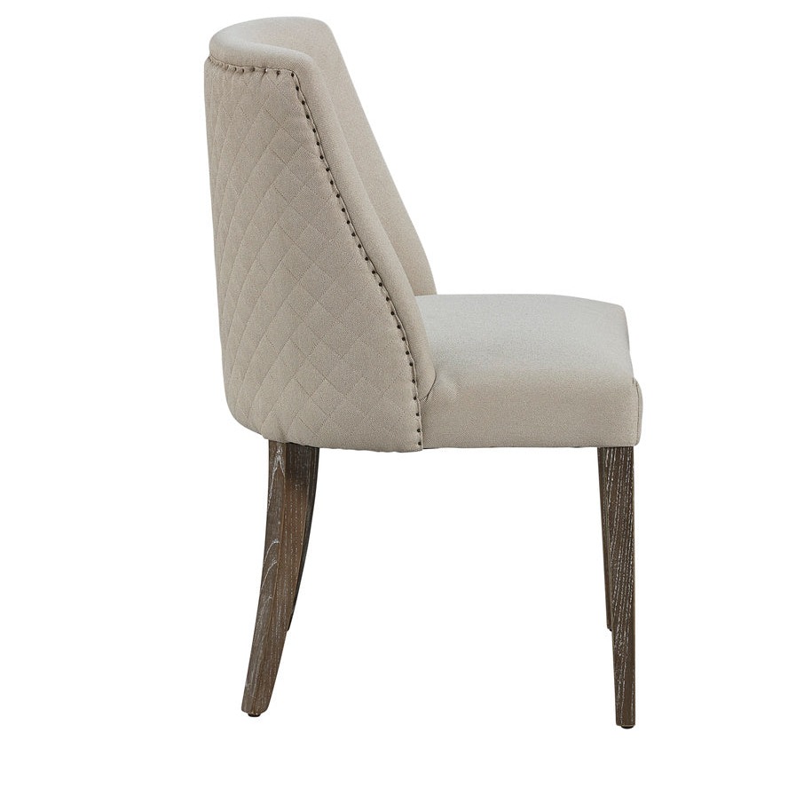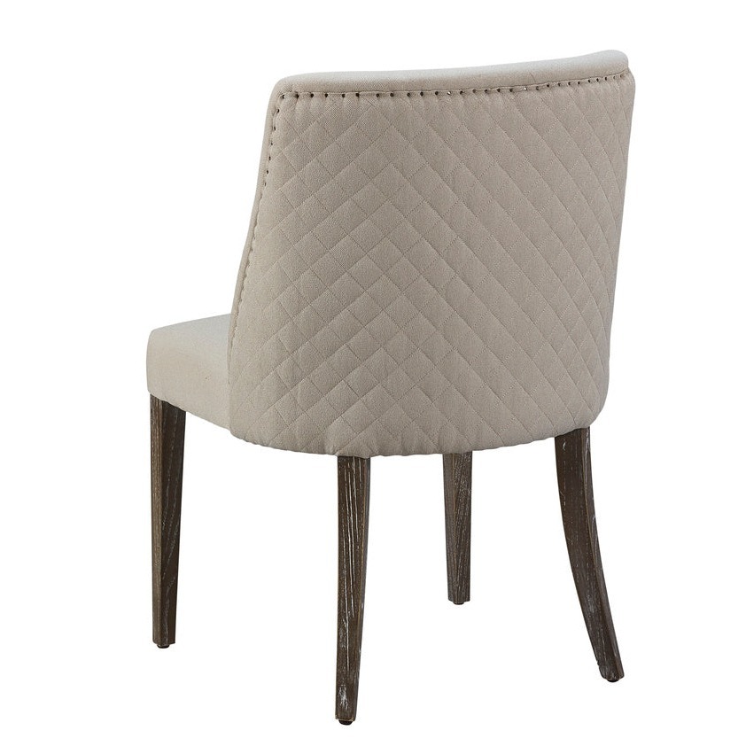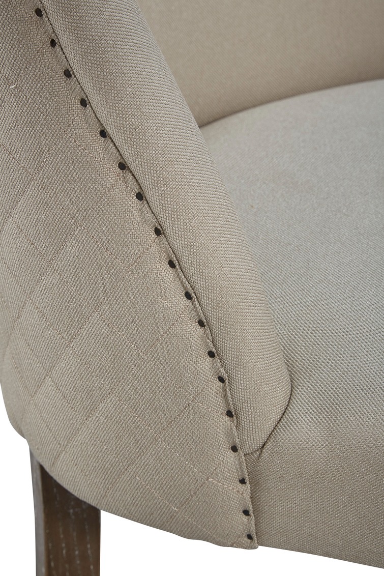 Whether you choose to use this charmer as a dining, desk or occasional chair, you will be delighted by the seating comfort offered by this performance linen upholstered beauty. Diamond stitched quilting highlights the back, and hand applied spit nails help define the gentle curve of the back.