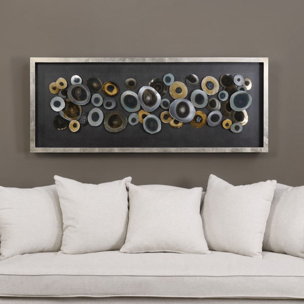 The Discs Shadow Box features overlapping iron discs with blow-torched finishes and hand-painted acrylic accents in silver, brown, and antique gold. Encased in a lightly antiqued silver leaf frame, it can be hung horizontally or vertically.