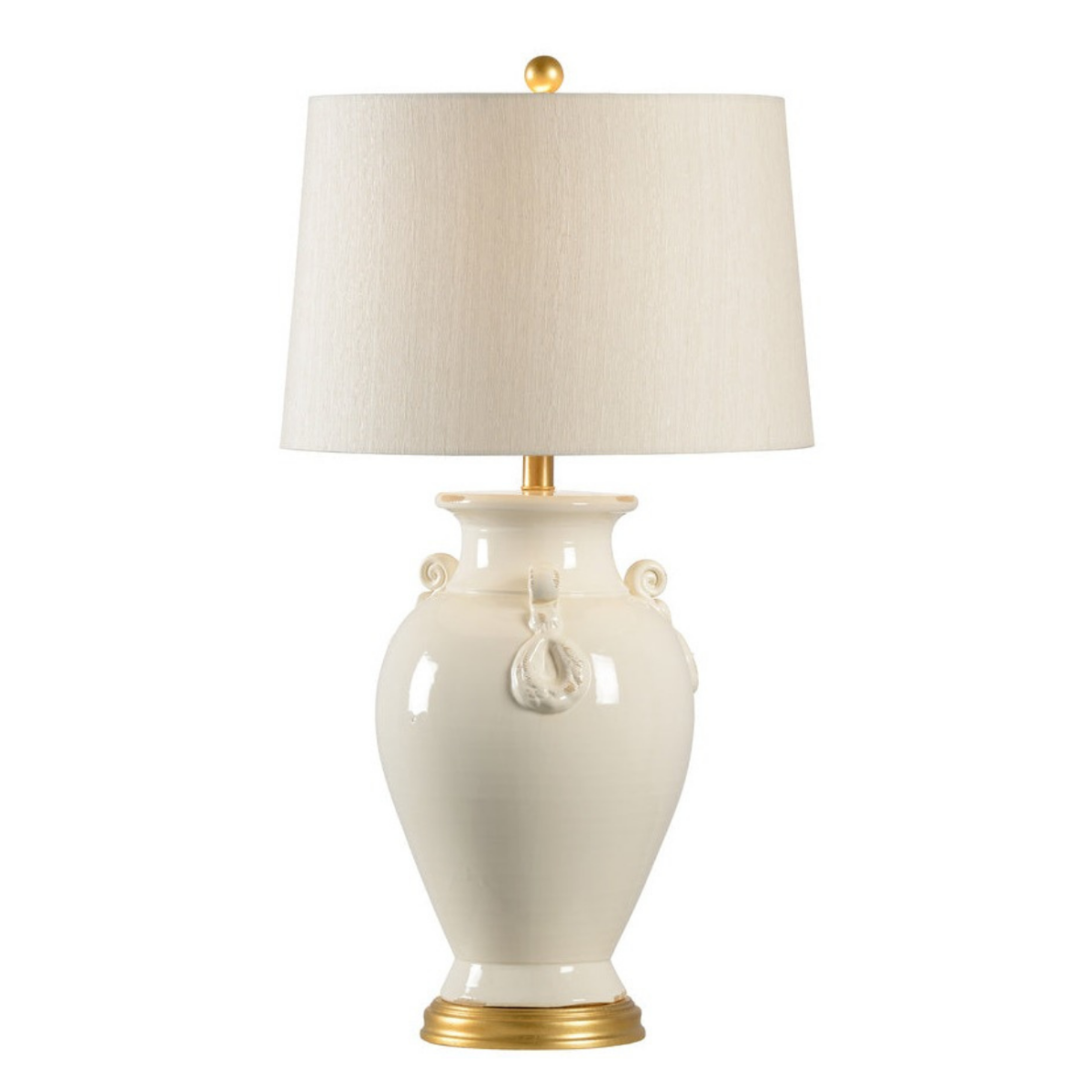 The Fabiano Lamp features hand-sculpted Italian ceramic in a warm aged cream glaze. A gold leaf mounting adds a refined touch. Designed by Vietri for timeless elegance.