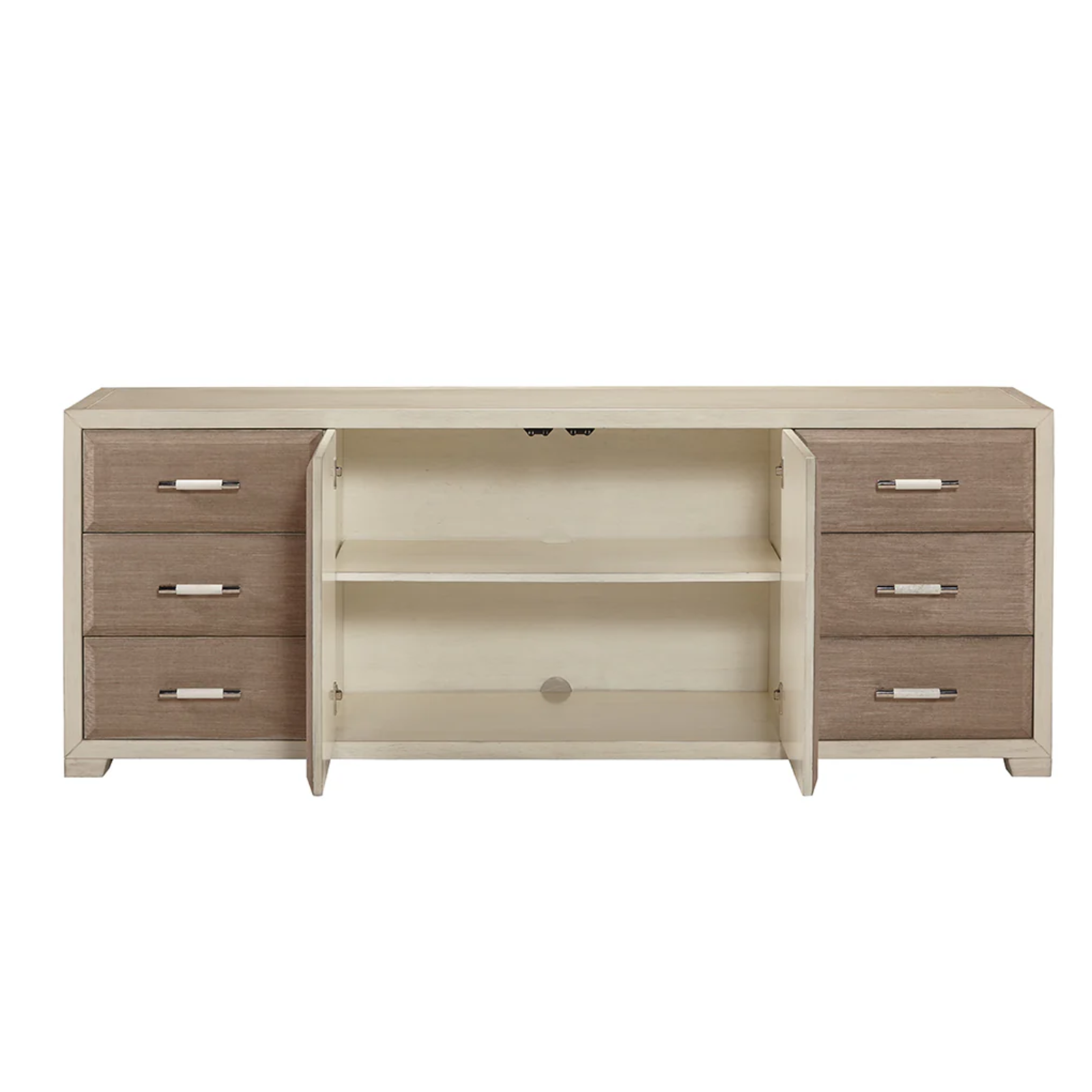 The Greco Console Cabinet combines modern sophistication with organic texture, crafted from oak and veneers, wrapped in linen fabric, and framed with faux bone trim. Its sleek polished nickel hardware and clean lines create a refined, transitional style that suits both modern and classic interiors.