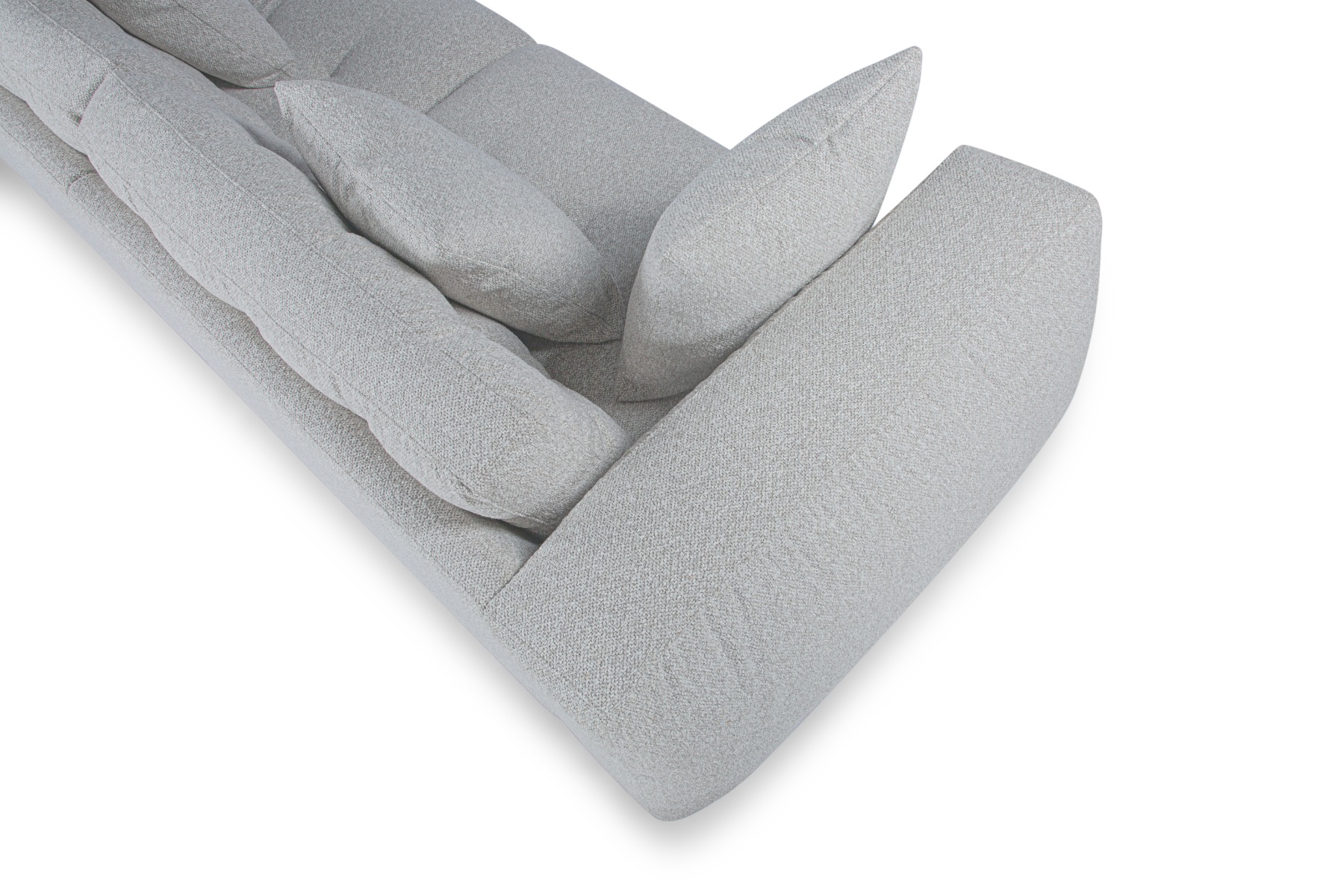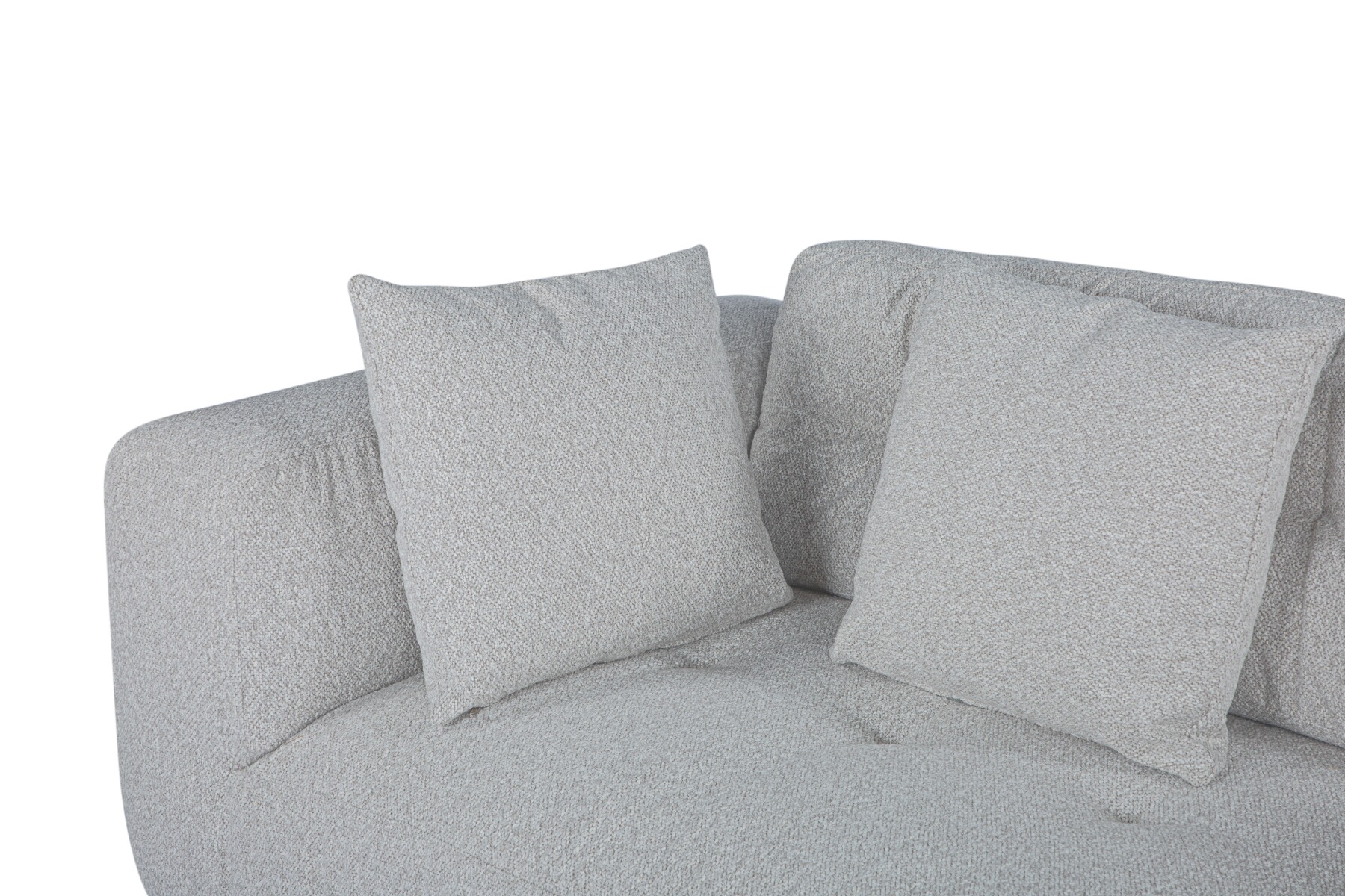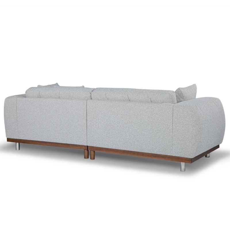 The Jasmin 4 seater sofa blends sculptural form with refined texture. Upholstered in soft champagne fabric, it rests on galvanized steel legs with a walnut-stained wooden base that adds warmth and contrast. A bold yet balanced piece that anchors any room with ease.
