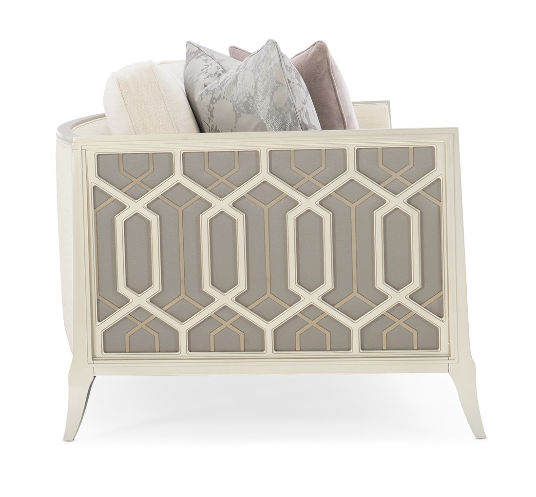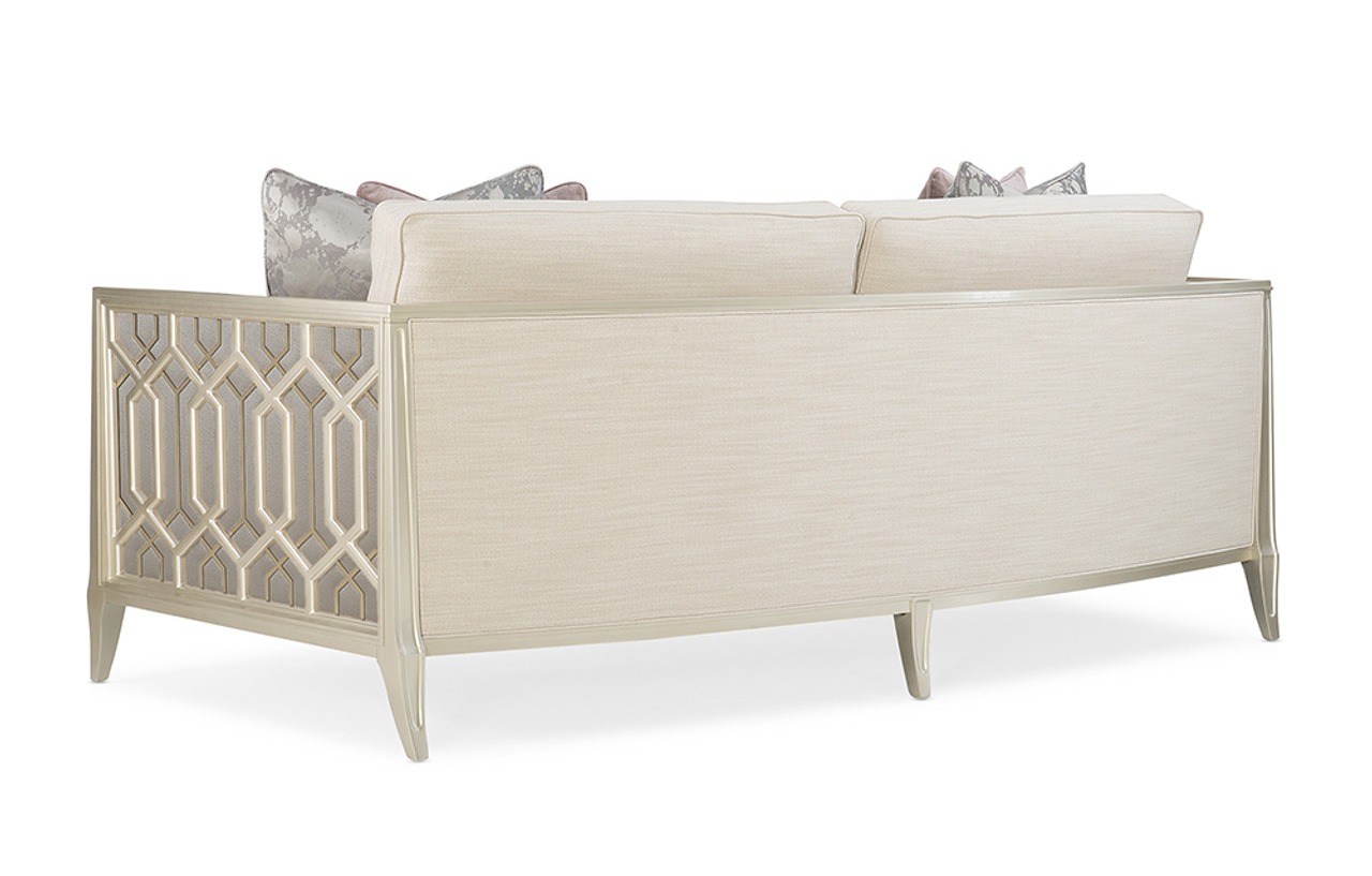 Every time you see the Just Duet sofa, you’ll remember the remarkable story behind its design inspiration. Its sumptuous seating area is bordered by a one-of-a-kind wood frame featuring carvings inspired by the patterns of a palace balcony railing in India. The layering of metal fretwork behind the wood was inspired by the dual shadow cast on the balcony by the setting sun as seen through the railing's design. Creating a high fashion look unique to itself, these elements are highlighted with illuminating shades of Soft Silver Paint and Champagne Gold. Exquisite fabrics and touchably luxe accent pillows complete its appeal.