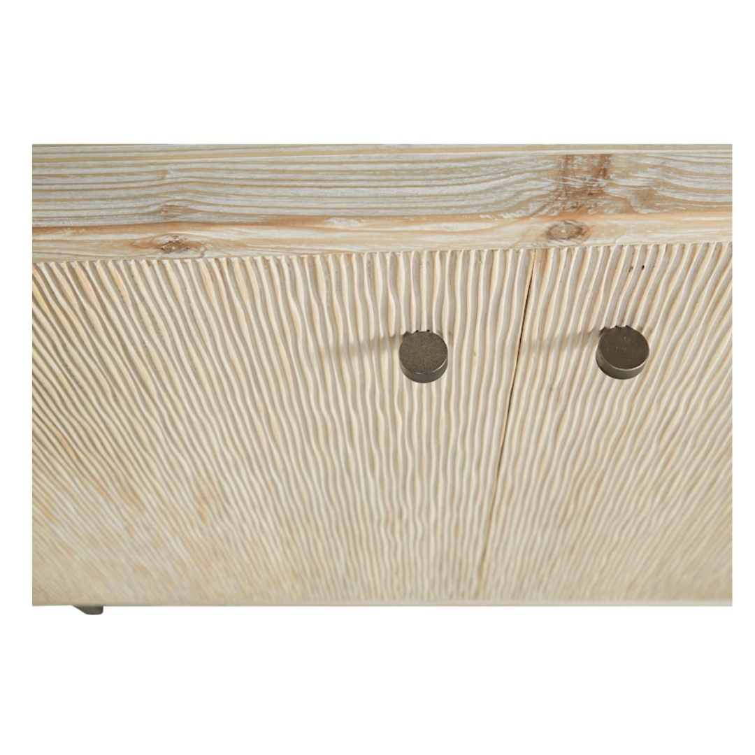 Sgraffito, the art of applying design by scratching the surface, is utilized to create an amazing play of light across the doors of this quietly breathtaking sideboard. The washed finish highlights the natural grain of the pine, and a nice touch of contrast is offered by the iron base and knobs. Within, there is tons of storage for all your stuff, whether it be board games, puzzles or china, and a fixed shelf keeps it all organized.