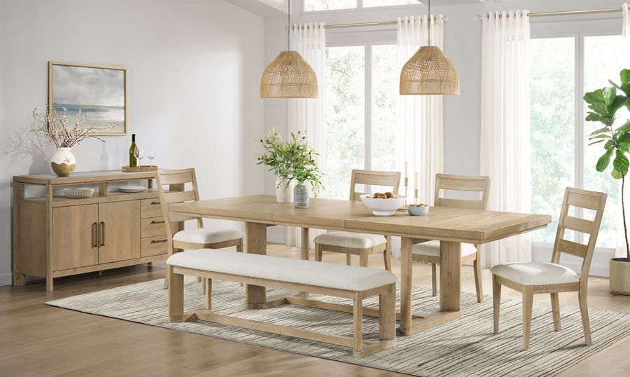 Burnished and aged hardware accent the sand dune colored finish featuring light wire brushing, glazing, rasping, and sand-through. This collection has both an extension leg table and formal trestle table. You'll find a perfect blend of modern, rustic, and coastal design aesthetics with the rounded shapes, neutral tones, and textural cream boucle fabric on the upholstered seats. The Pacific Grove's casual, yet sophisticated look will bring out the best in your space.