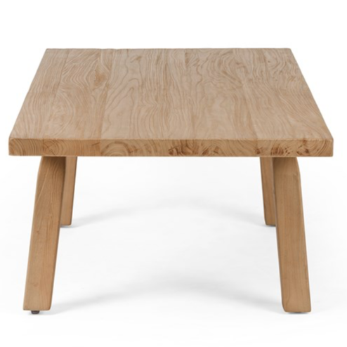 Inspired by early French farmhouse styling, a simple-spirited coffee table is made from natural-finished reclaimed elm, with exaggerated joints and dowels for character.