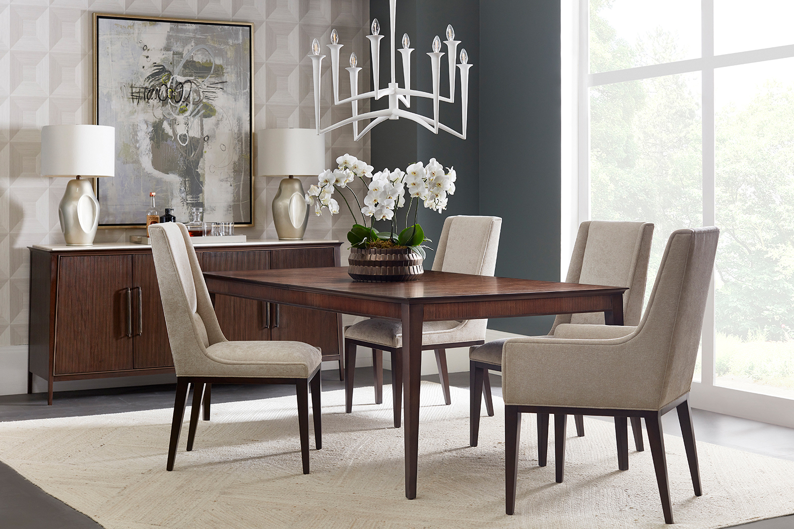 The Lido Credenza features a sophisticated tapering silhouette and reeded angular doors, crafted from Prima Vera in our Bistre finish. The custom forged hardware, finished in a dark rubbed bronze, echoes the reeded details throughout.