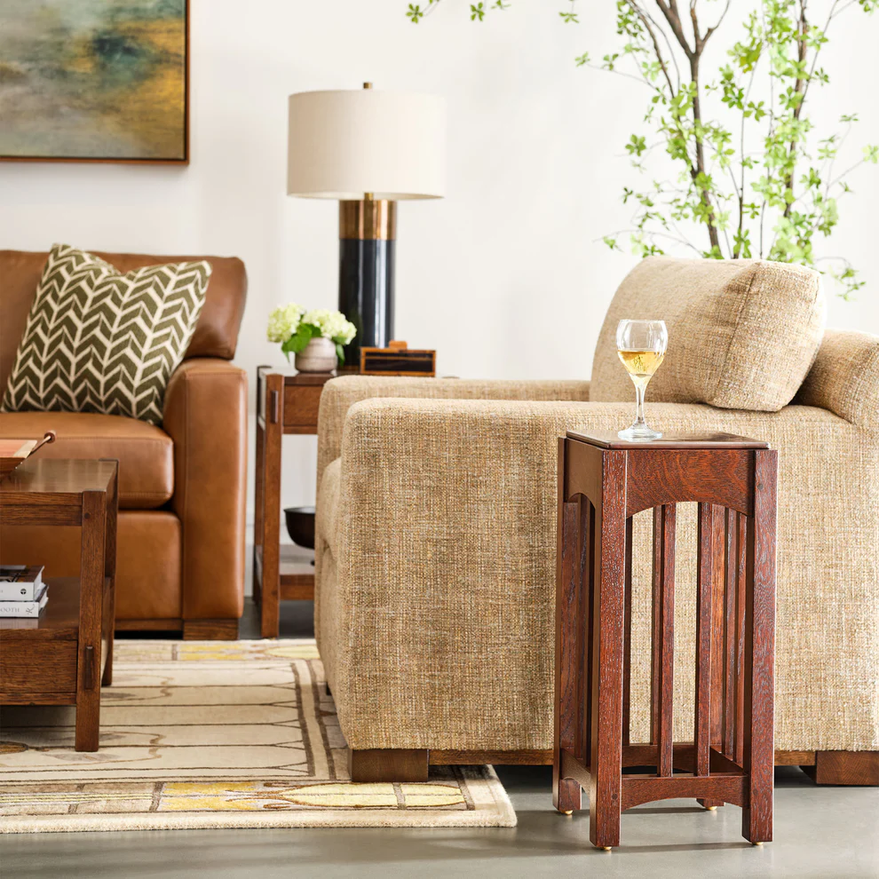 Inspired by the iconic designs of Charles P. Limbert, the Copper-Top Drink Table blends historical charm with modern versatility. Handcrafted using traditional Mission-style techniques, this modestly scaled piece features a smooth copper top set atop a tall, square oak base. Delicate square spindles and arched aprons on each side lend architectural interest, making it an ideal accent table or plant stand in any room. Perfect for smaller spaces, this piece is part of our Little Treasures collection celebrating craftsmanship in every detail.
