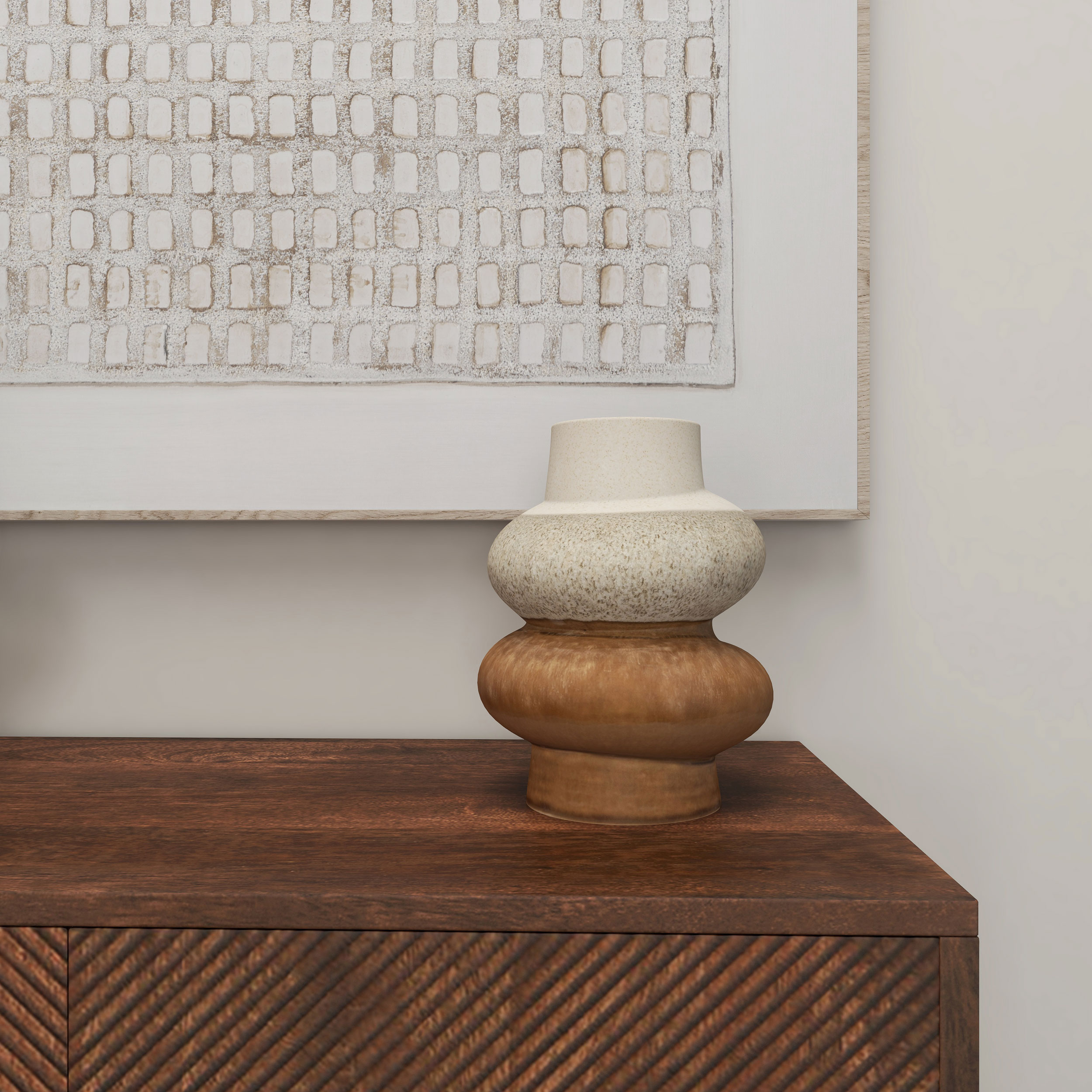 The Molokai table top ceramic vase showcases a distinctive and artistic design, available in two sizes. It features a multi-tiered structure with each section having its own unique texture and color. The top section is a creamy beige with a smooth finish, providing a soft and elegant look. The middle section has a speckled grey texture, adding a tactile and visual contrast. The lower sections display a rich glossy brown hues, giving the vase an earthy and organic feel. This combination of shapes, colors, and textures makes the Molokai vase a versatile and eye-catching piece for various interior styles.