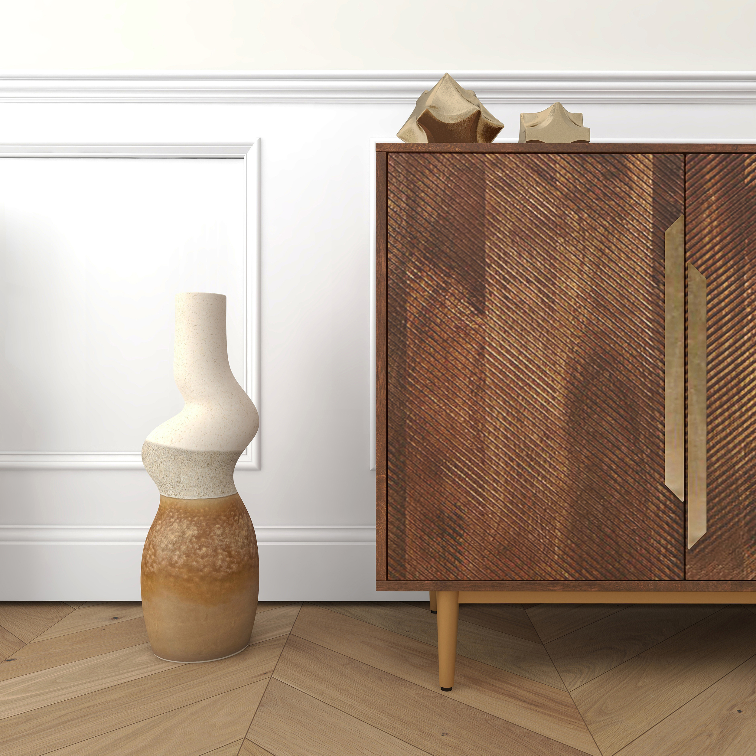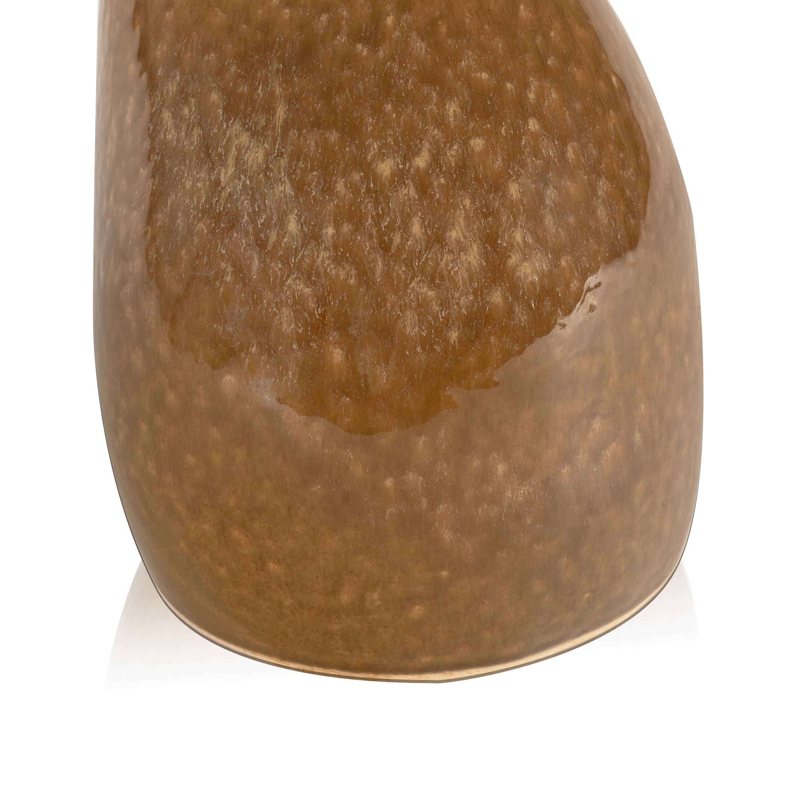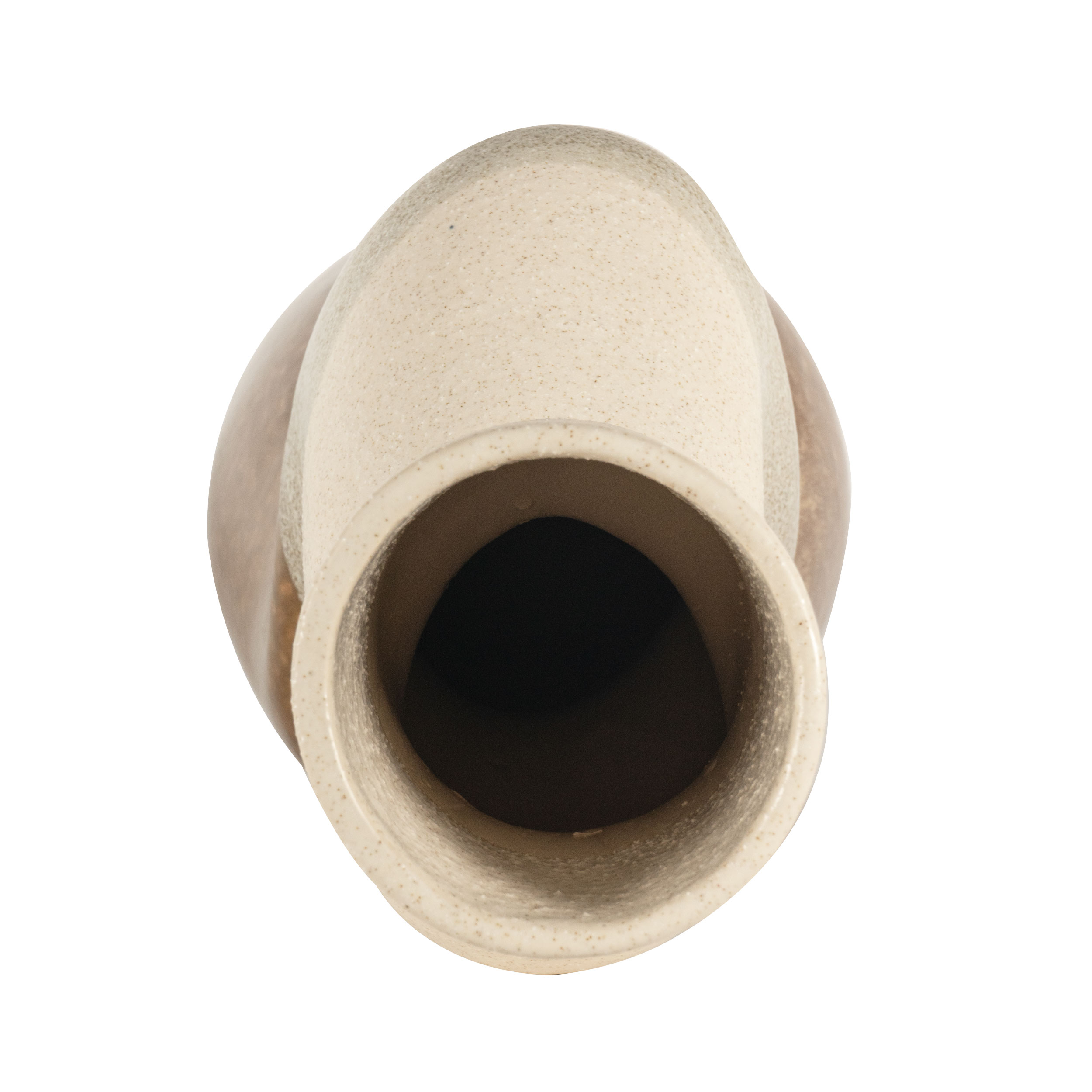 The Montego floor ceramic vase showcases a distinctive and artistic design, available in two sizes. It features a three-tiered structure, each tier with its own unique texture and color. The base is rounded with a glossy finish in warm, earthy brown tones, reminiscent of natural clay or stone. The middle section narrows slightly and has a textured surface that looks like fine sand or speckled granite, in neutral beige hues. The topmost part extends into a slender neck with a matte finish in off-white, creating a striking contrast with the detailed sections below. This combination of shapes and colors gives the Montego vase an organic yet modern appeal, making it a versatile piece for various interior styles.