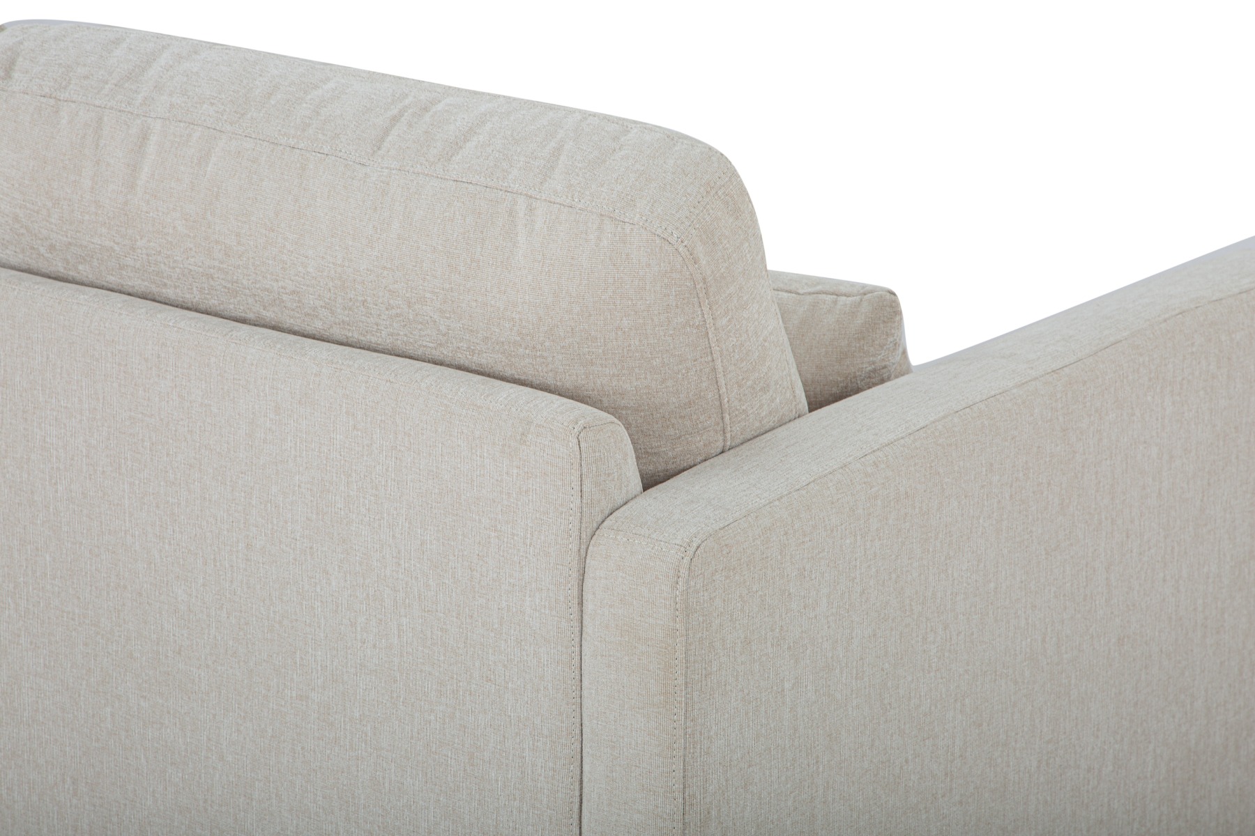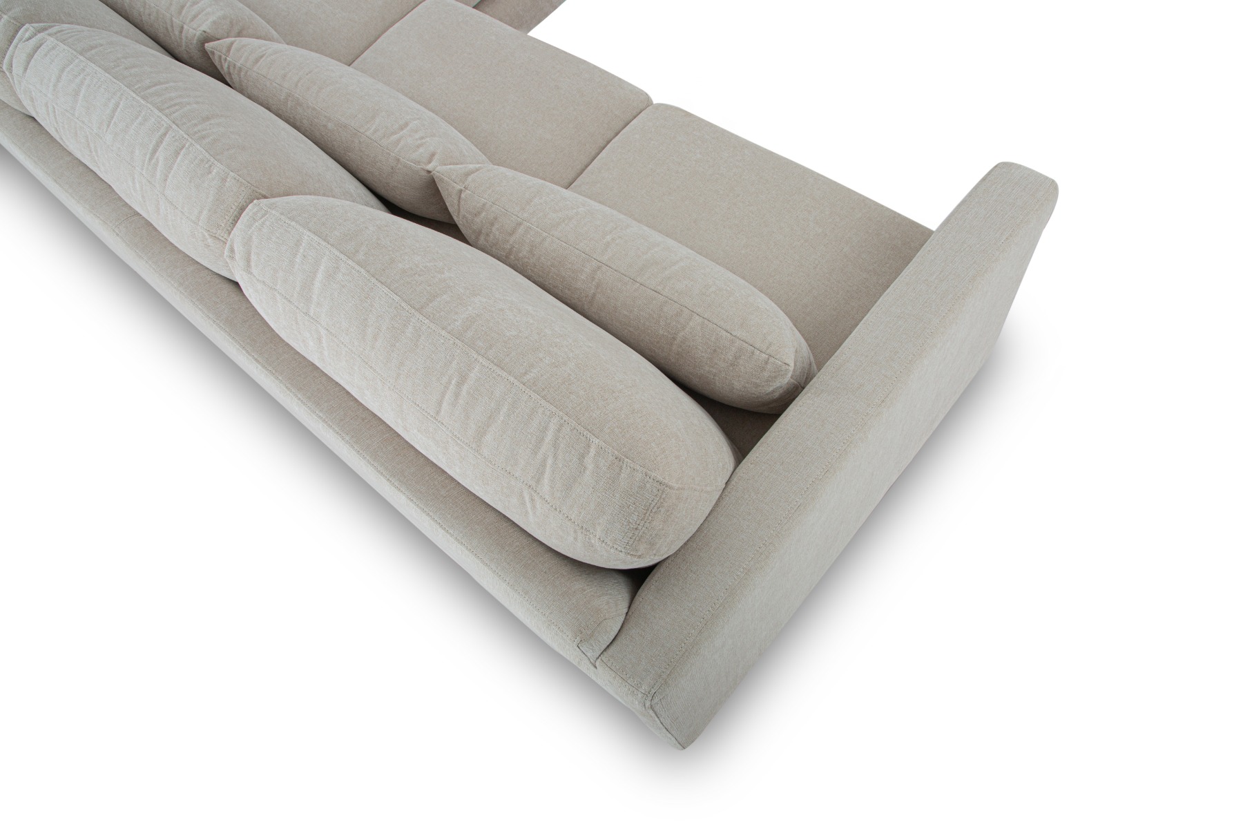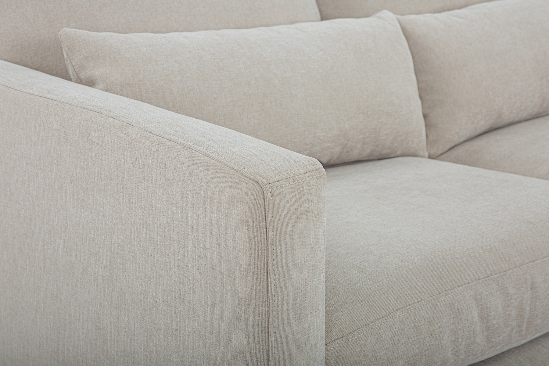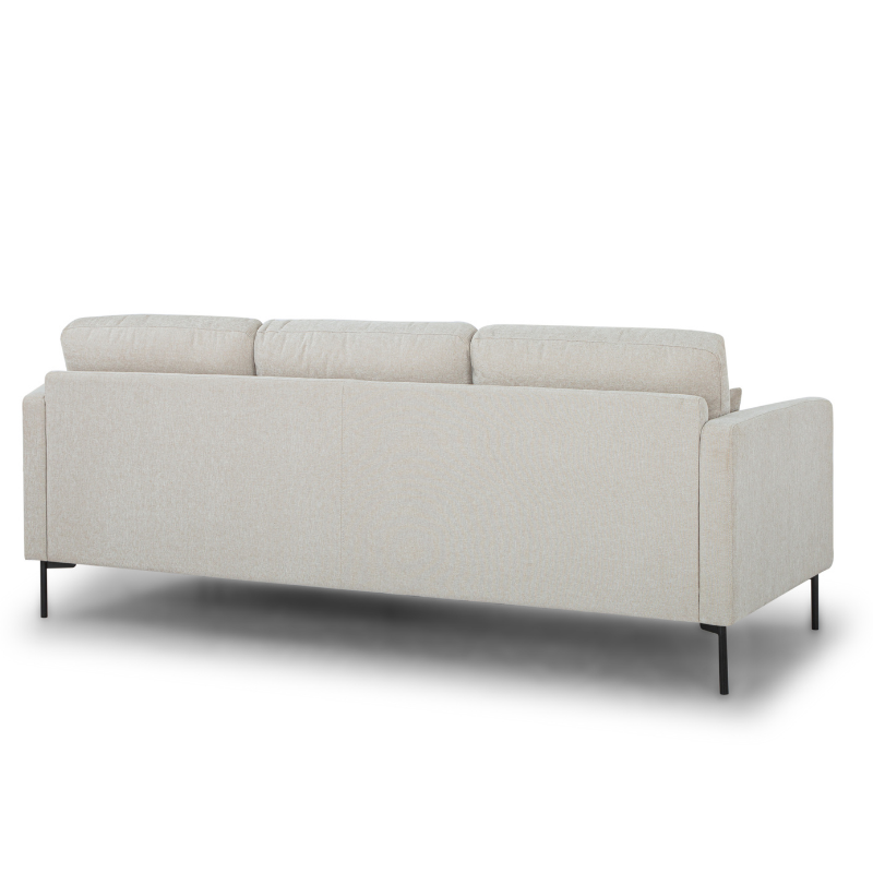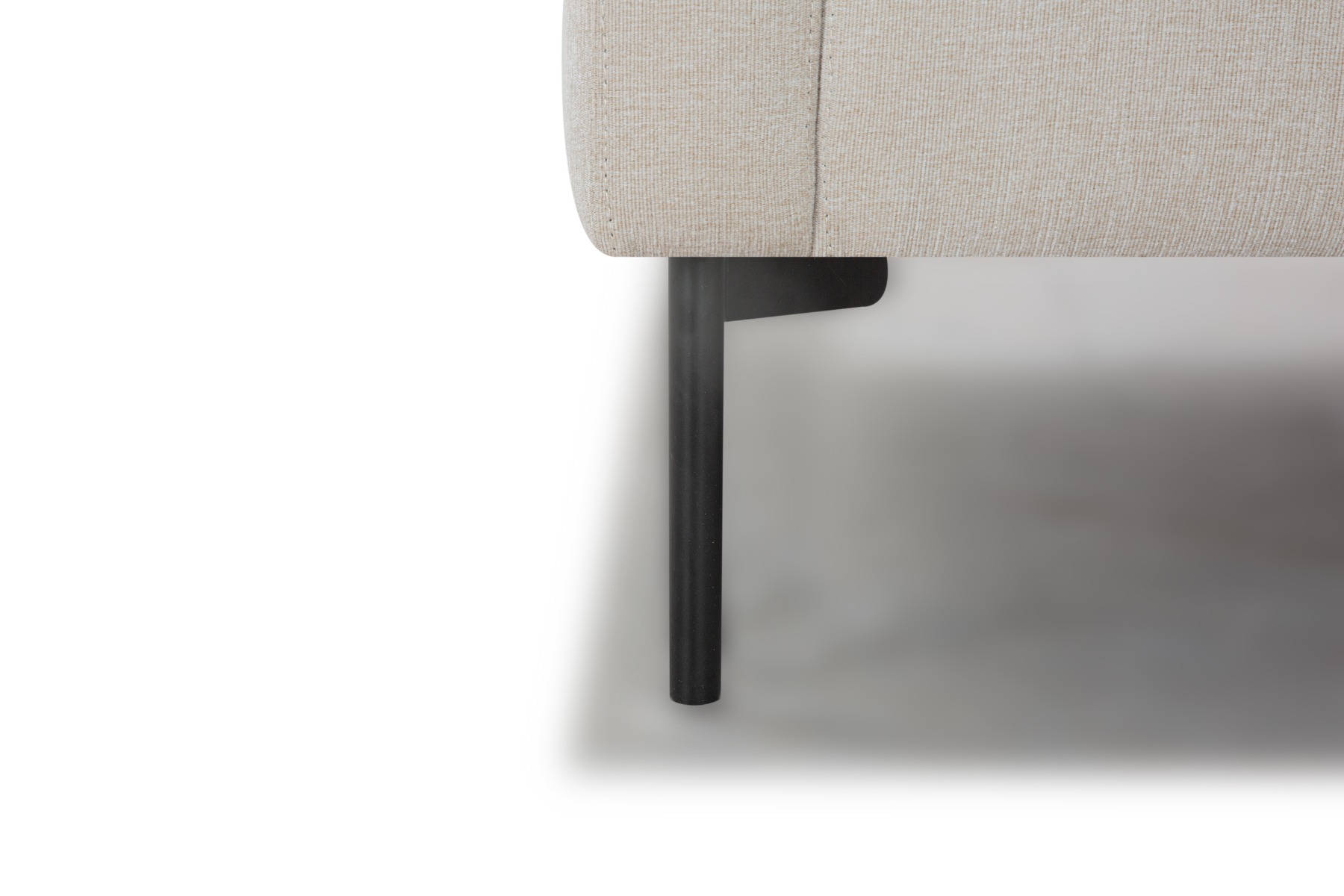 The Nemo sectional is designed for adaptable living, with a three-seat layout and a chaise that easily switches from left to right to fit any room arrangement. Its smooth beige fabric offers a timeless, neutral look that blends seamlessly with a range of interiors, while the matte black metal legs provide a striking contrast and modern sophistication. Generously padded cushions create a plush, inviting seat, perfect for both casual lounging and entertaining. Combining comfort, style, and flexibility, this sectional serves as a versatile centerpiece for contemporary homes.