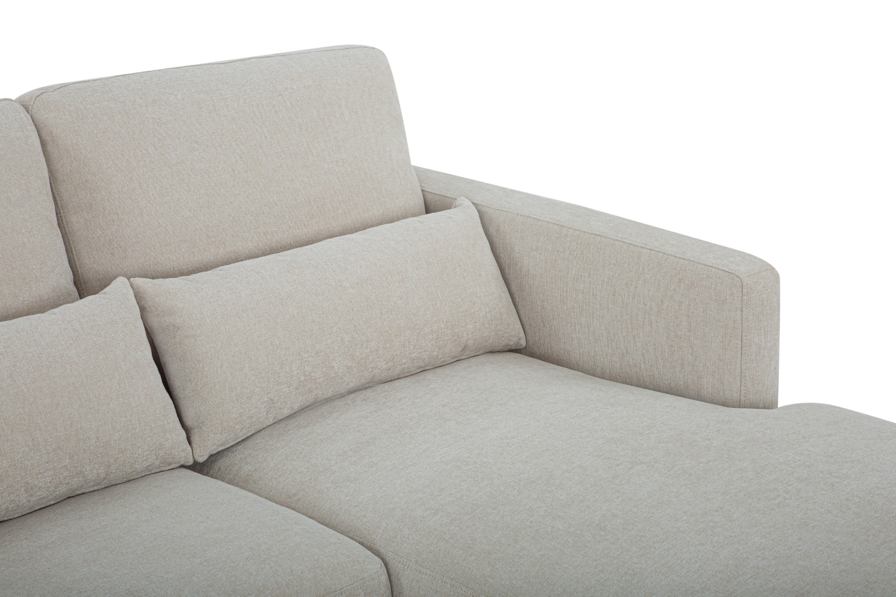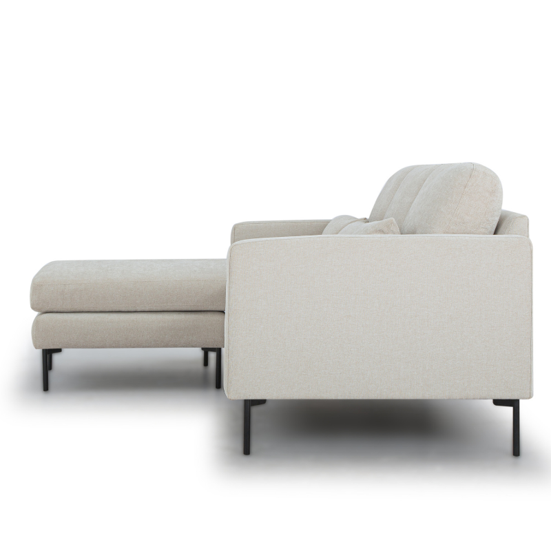 The Nemo sectional combines modern style with functional versatility, featuring a beige fabric finish and a reversible chaise that can be positioned on either side to suit your layout. Sleek matte black metal legs add a contemporary edge, balancing soft comfort with clean design.