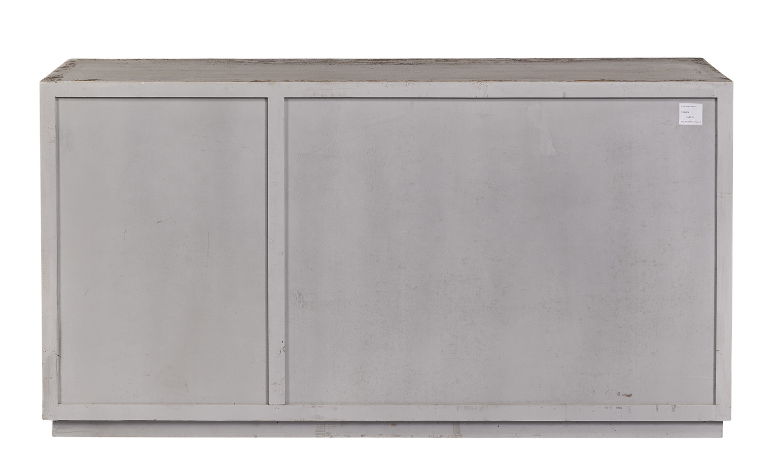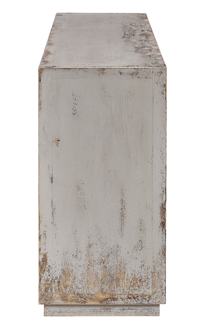 Crafted of reclaimed pine, and hand painted with a lightly distressed grey finish, this handsome sideboard features uniquely detailed doors. The arresting carved panels catch light and create a play of shadows on the framed doors, making this a quietly impactful addition to your home.
