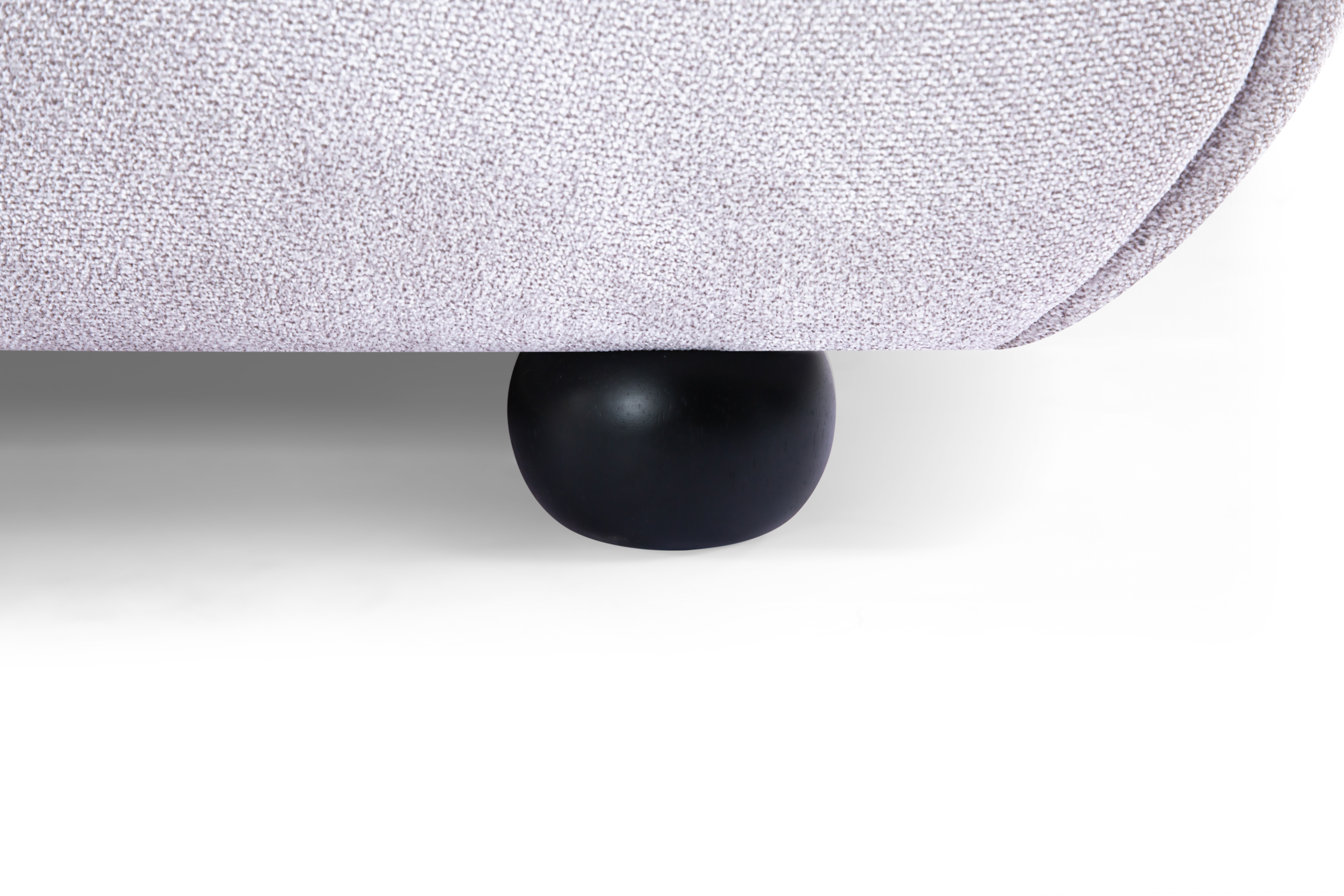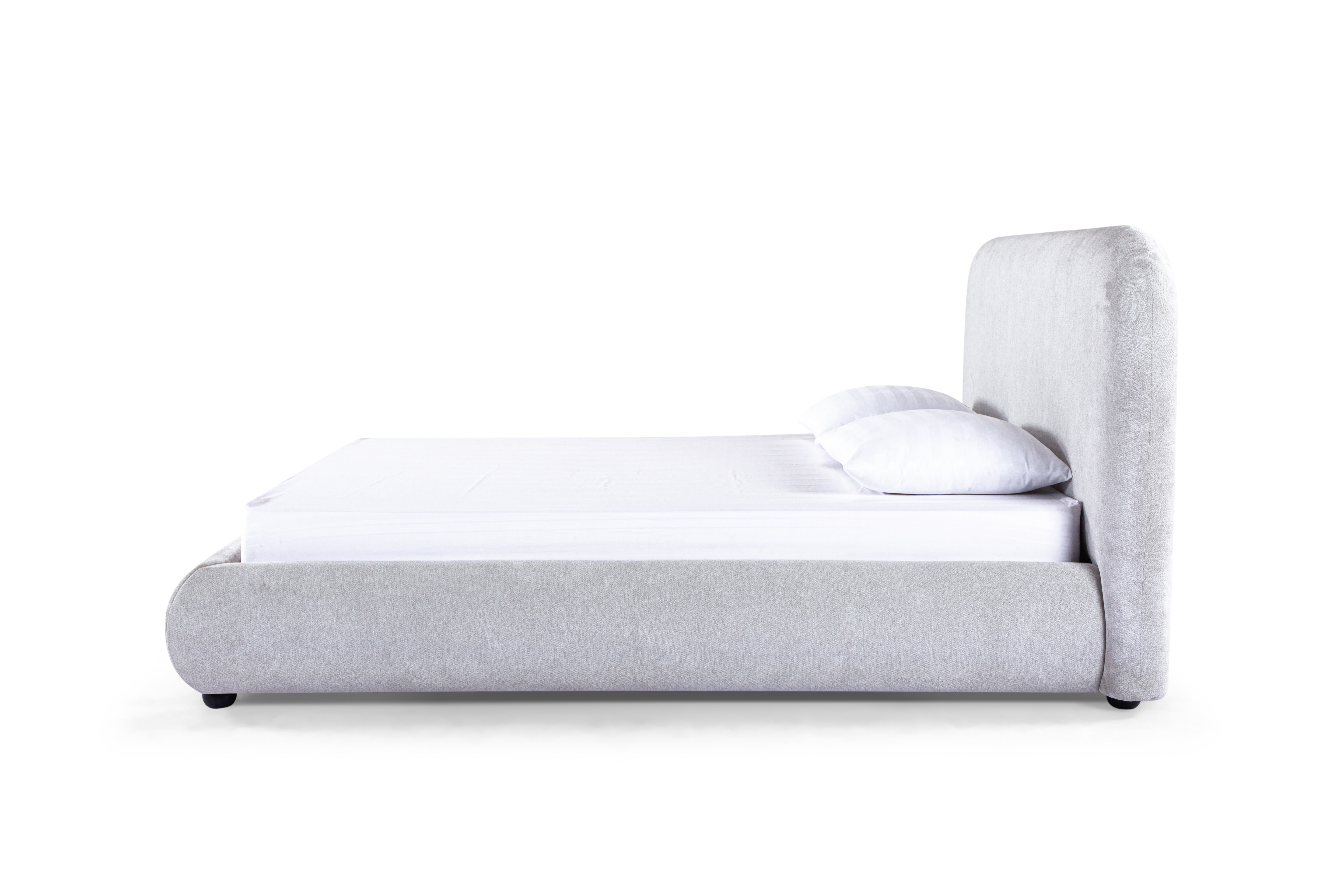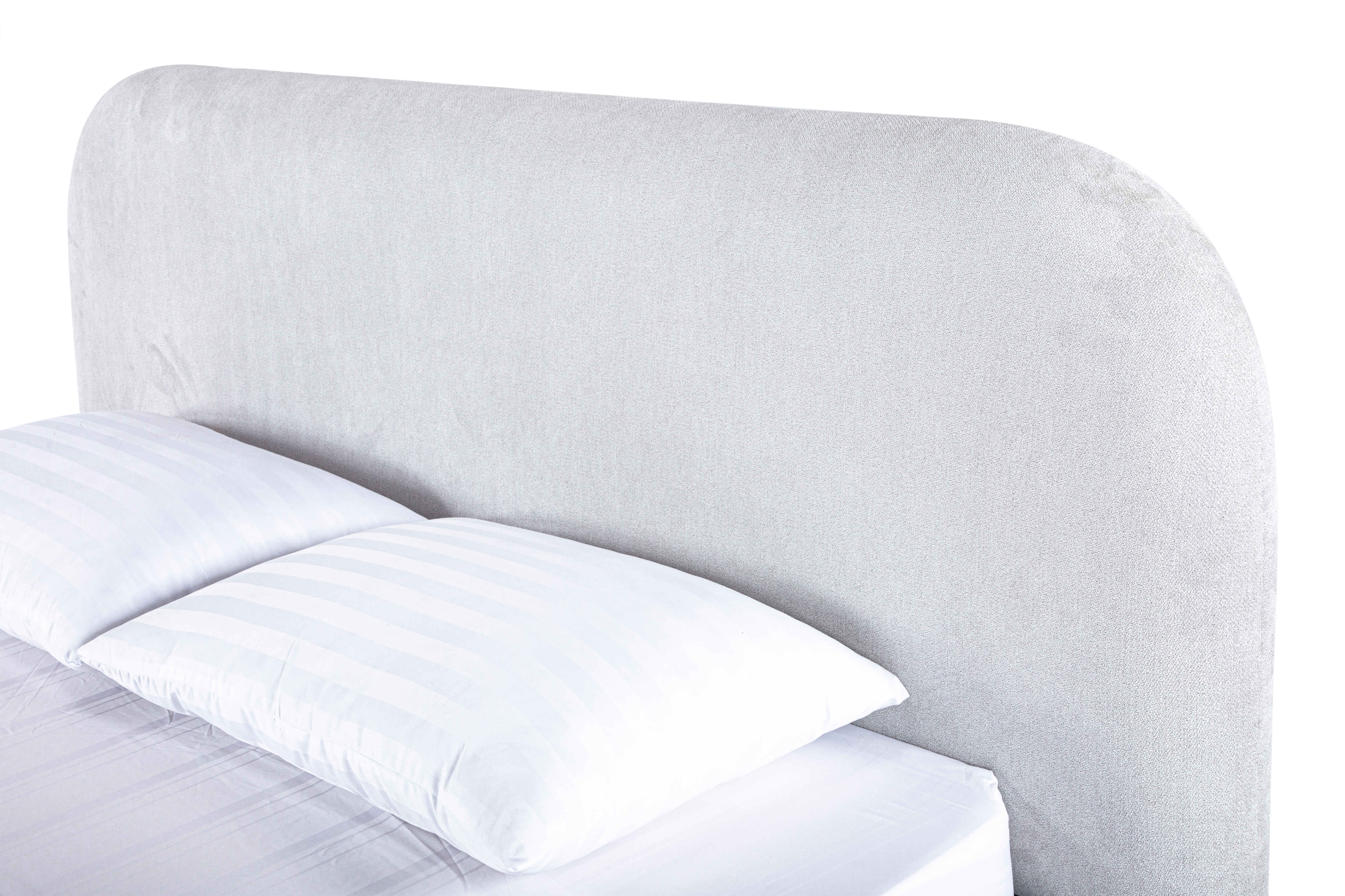 The Oslo King Bed has a soft, rounded design, featuring a curved, padded headboard upholstered in light gray fabric. The frame mirrors the headboard's gentle contours, giving the bed a cozy and modern aesthetic. Its plush texture and minimalist shape make it a stylish yet comfortable choice for contemporary bedrooms.