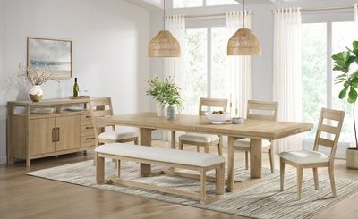 Bring the outside in with the light and airy, casual style of the Pacific Grove collection. Burnished and aged hardware accent the sand dune colored finish featuring light wire brushing, glazing, rasping, and sand-through. This collection has both an extension leg table and formal trestle table. You'll find a perfect blend of modern, rustic, and coastal design aesthetics with the rounded shapes, neutral tones, and textural cream boucle fabric on the upholstered seats.