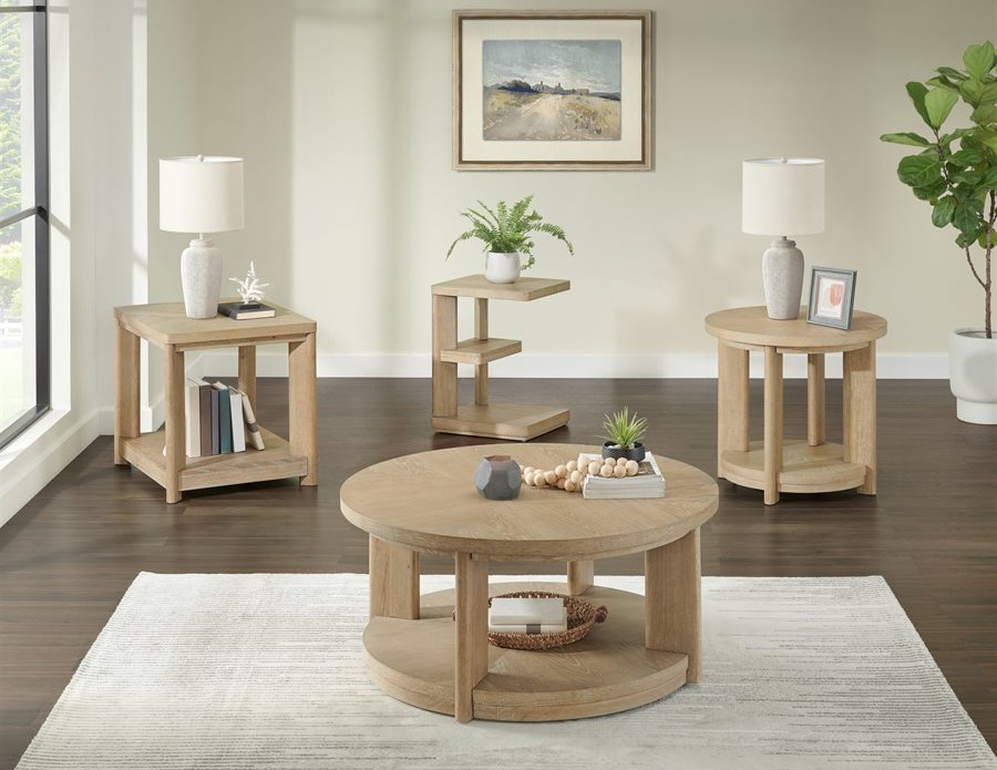 The Pacific Grove End Table blends modern, rustic, and coastal styles, featuring a quarter-turned oak veneer top that highlights natural wood grain. Finished in a warm sandy tone with distressed detailing, it offers casual elegance in a compact design perfect for smaller spaces.