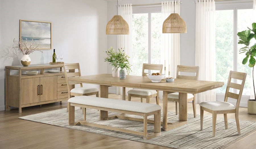 The Pacific Grove collection offers both an extension leg table and a formal trestle table, blending modern, rustic, and coastal styles. Rounded shapes, neutral tones, and cream boucle seats create a casual yet refined look.