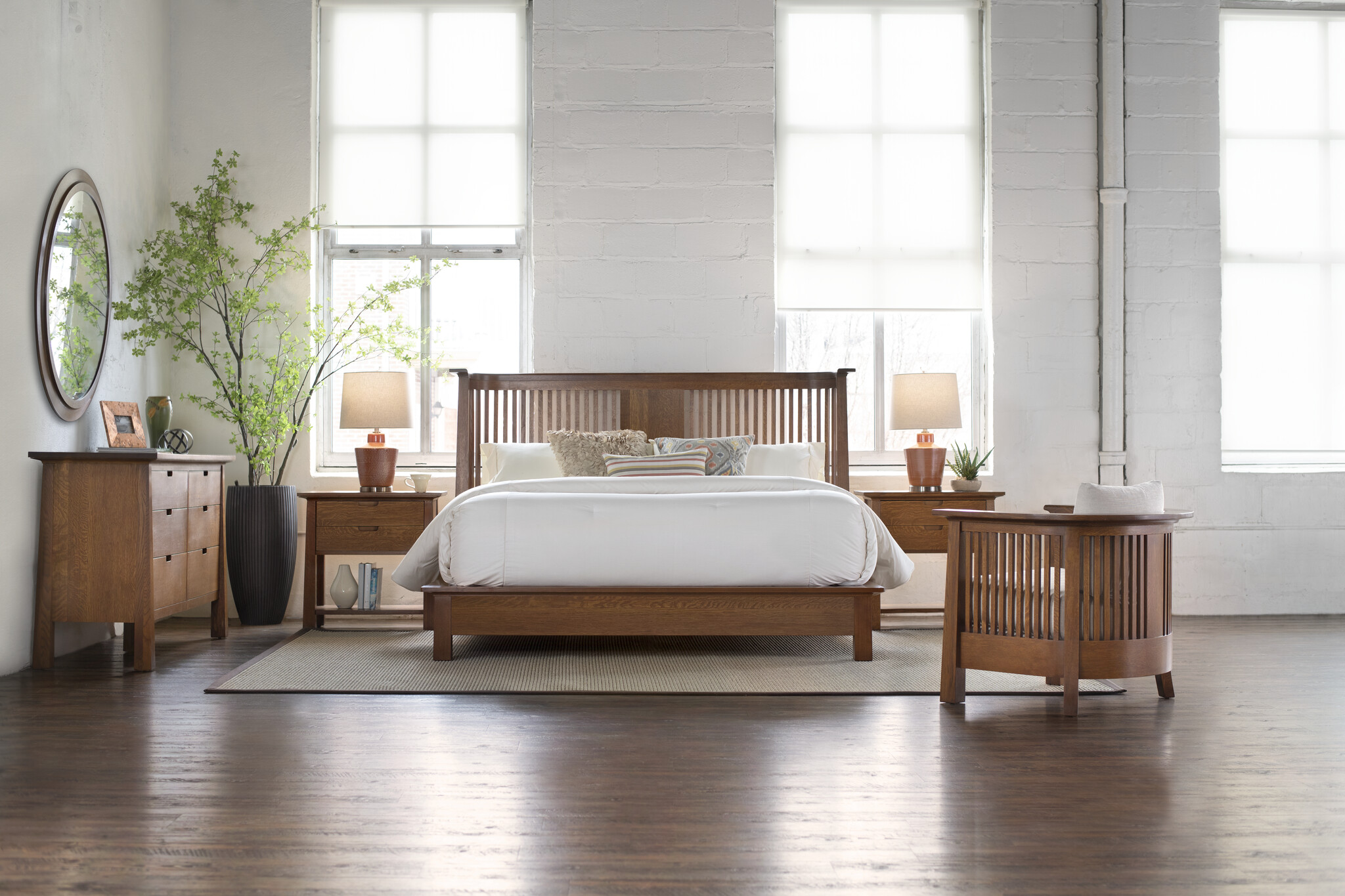 In a subtle update to Mission design, this chest lifts and lightens the familiar Arts and Crafts shape. Reverse-tapered posts become more delicate as the approach the top, whose overhang is supported by a radial curve. Five side-hung, center-guided drawers with finger pulls provide plenty of spacious storage.