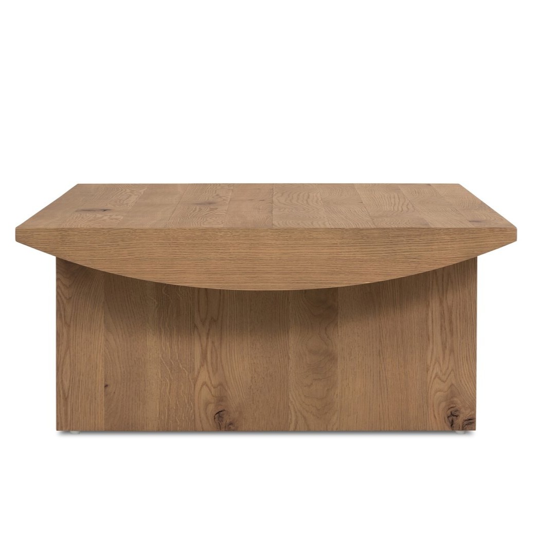 Low-styled and shape-driven, a coffee table made from thick-cut oak veneer features overscale proportions and half-moon shaping, with a warm grey-brown finish.