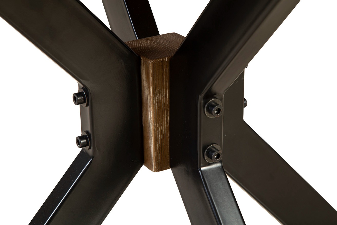 The Pierre Dining Table combines rustic charm with modern design. Its reclaimed pine and alder round top features a natural wood finish that adds warmth and character, while the dark metal sculptural cross base provides a striking contemporary touch. Perfect for smaller spaces, this dining table comfortably seats 4-5 people, making it an ideal centerpiece for intimate gatherings or casual meals.