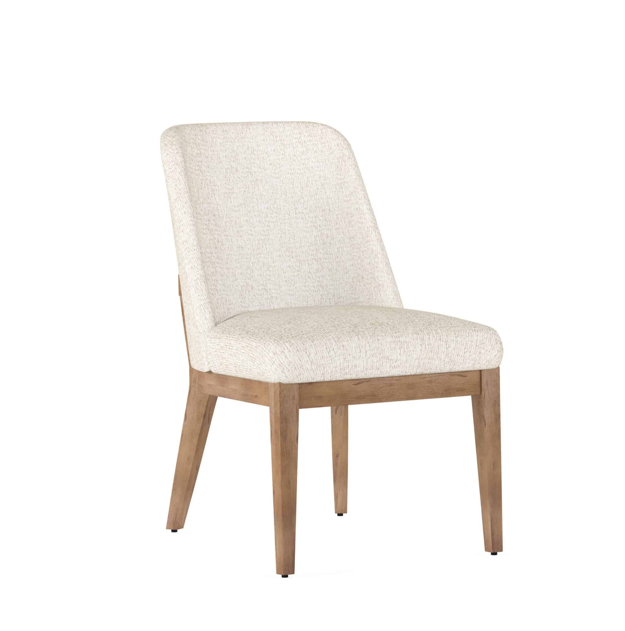 This side dining chair is inspired by the geometric forms of modern art and architecture. An exposed wood frame finished in warm sienna brown surrounds a gently curved backrest, fully upholstered in a creamy neutral woven fabric. Simple and sophisticated, this chair brings comfort and style to the table.