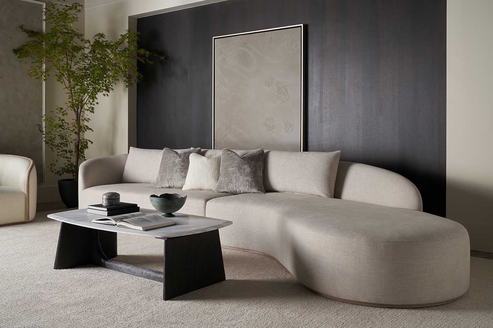 The Repose Wooden Coffee Table features a curved edge Gan Eden quartz top set on solid trapezoid-style legs for a bold, modern look. Its hand-finished veneer enhances the natural wood grain, available in Grey Oak or Charcoal Oak.