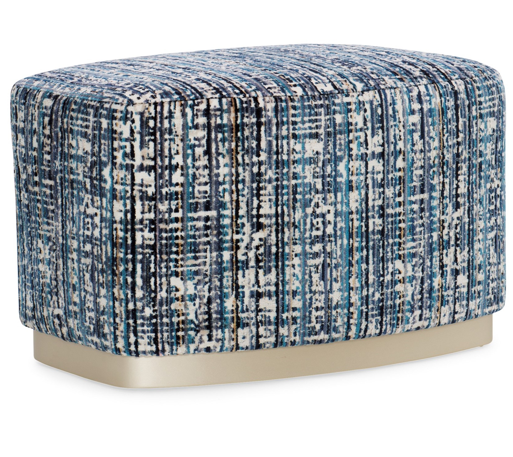 Fashioned after the cut of a precious gem, this unique ottoman combines the best of both fashion and function. Perfect for extra seating or placed at the end of the bed, it's dressed in a luxurious cut velvet with an intriguing pattern woven in shades of cerulean and smoke. A Soft Radiance finish highlights its base and ensures its chic glamorous appeal.