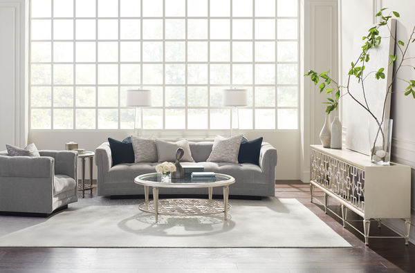 Bring everyday elegance to your living space with the Social Gathering Cocktail Table. Featuring an airy, open design, it includes a round beveled glass top and a lower shelf with intricate metal fretwork in a stylish graphic pattern. Finished in soft Taupe Paint with Taupe Silver Leaf accents, this table blends lightness and strength for a refined, timeless look.