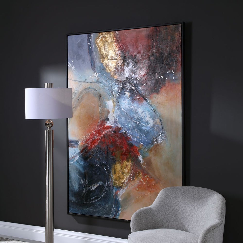 Hand painted on canvas, this abstract artwork showcases rich red and deep blue tones with silver and gold leaf highlights and a matte black gallery frame. Due to the handcrafted nature of this artwork, each piece may have subtle differences. This piece may be hung horizontal or vertical.
