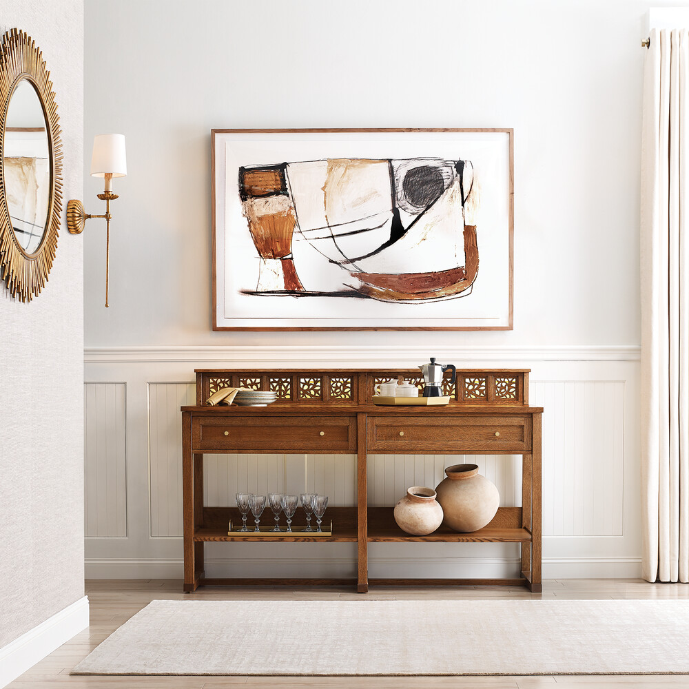 This version of the white oak Surrey Hills Server includes a full-length fretwork gallery topped with a shallow shelf; its laser-cut panel is quietly lit from behind for a gorgeous effect. Beautiful and functional, the server stands on U-shaped legs that meet at a long stretcher at the floor. Two wide drawers with tapered satin brass knobs offer storage for utensils or table linens, and a spacious lower shelf backed by a smooth gallery accommodates large serveware or collectibles.
