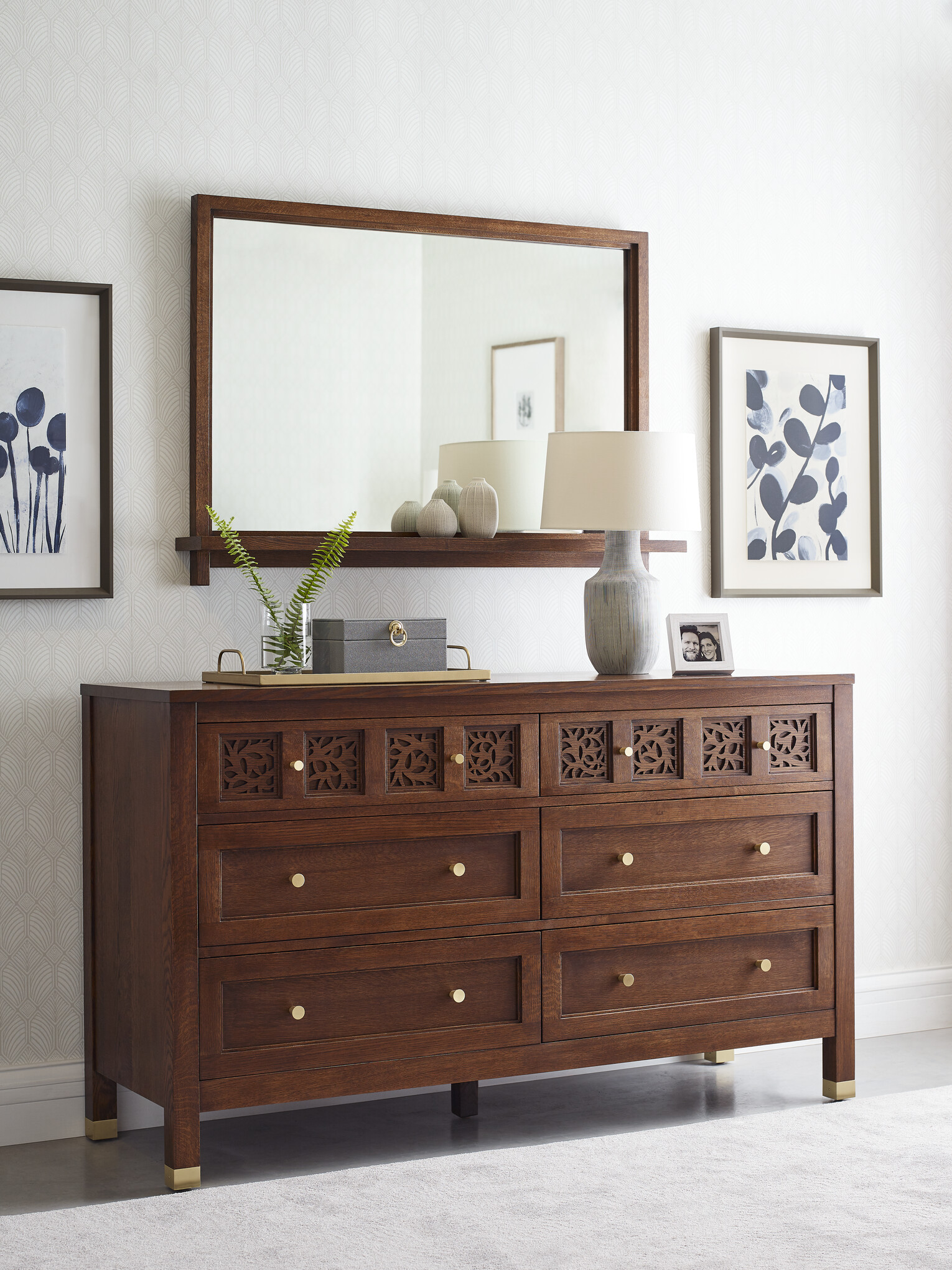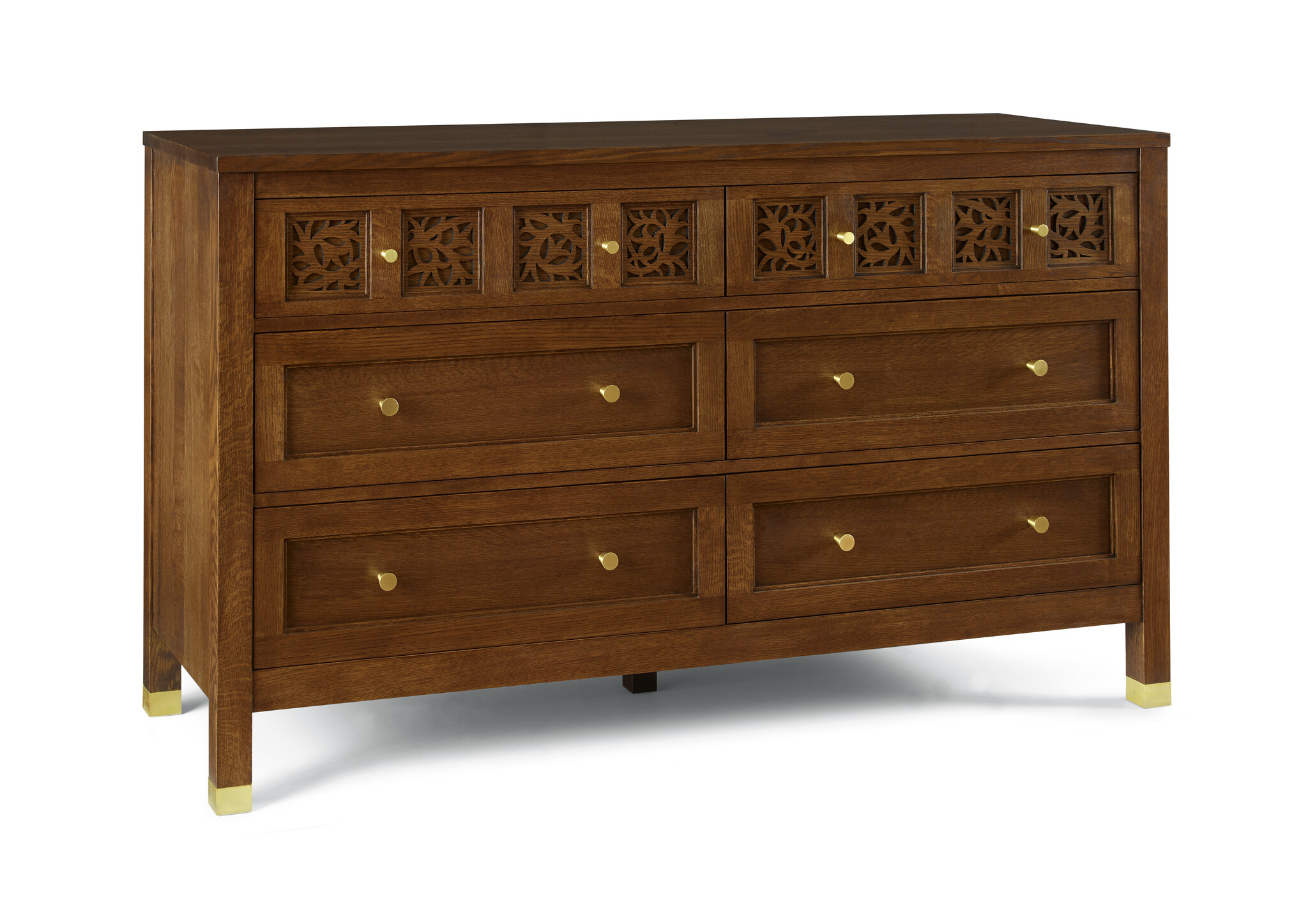 The Surrey Hills Six-Drawer Dresser, crafted from quartersawn white oak, features artisan fretwork on the top drawers, tapered satin brass knobs, and stepped stiles for added depth finished with satin brass ferrules for a refined touch.