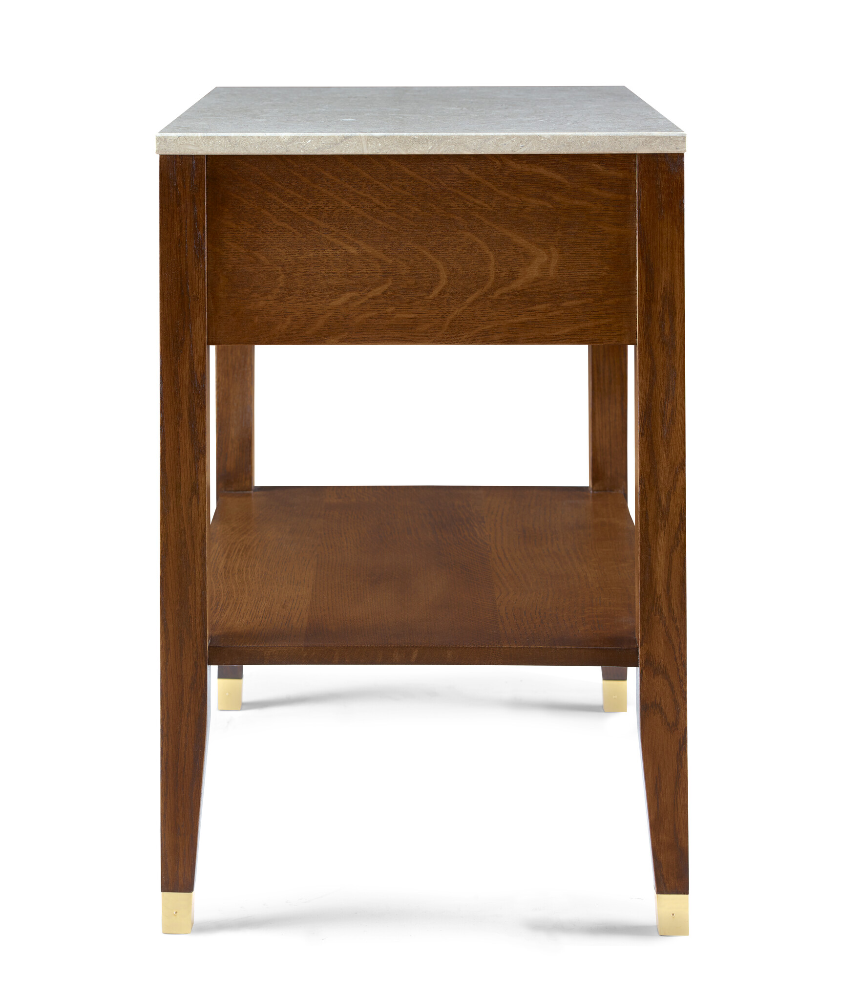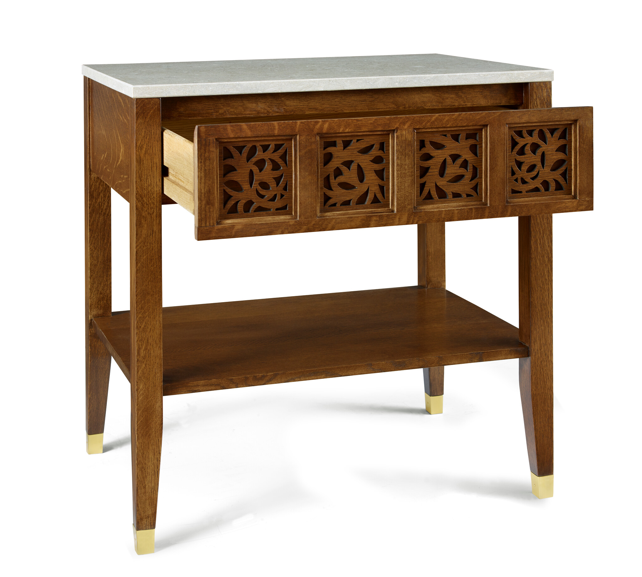 This Open Nightstand brings a lighter look to the Surrey Hills bedroom thanks to its open shelf and long legs that taper to the floor. A single side-hung, center-guided drawer with finger pull is faced with our stepped fretwork and its sinuous laser-cut vines. A silky-smooth stone top in natural sea grass hues completes the picture.