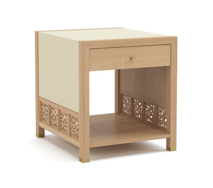 The Surrey Hills Trellis End Table is crafted from quartersawn white oak with a vegan leather top that flows over laser-cut vine fretwork sides. It includes a side-hung drawer with a satin brass knob, a low gallery shelf for storage, and is finished with mitered joints and brass ferrules for a refined, natural look.