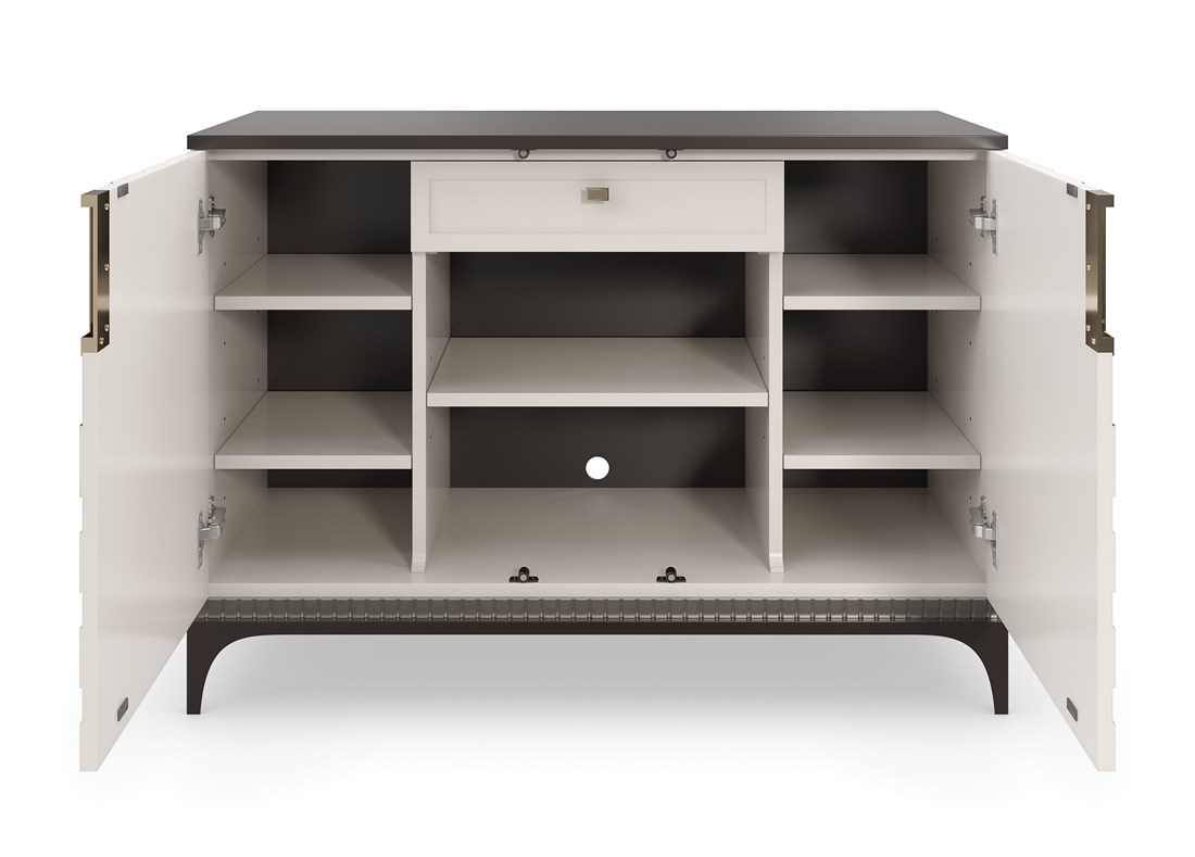Inspired by Greek mythology, this chest features a bold labyrinth design with alternating Dark Chocolate and Dove White bands. Custom green marble hardware, trimmed in Whisper of Gold, adds a striking focal point. Ideal for making a statement in entryways, living, and dining spaces.