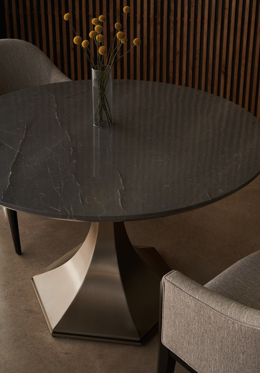 Perfectly scaled for smaller spaces, this elegant 48" pedestal table features a luxurious grey sintered stone top with veined marble aesthetics. Resting on a cinched, fluted base in a Brushed Antique Brass finish, it comfortably seats up to six, making it ideal for entryways or intimate dining areas.